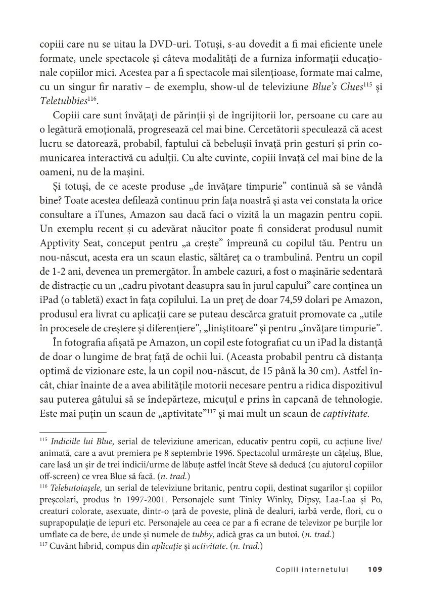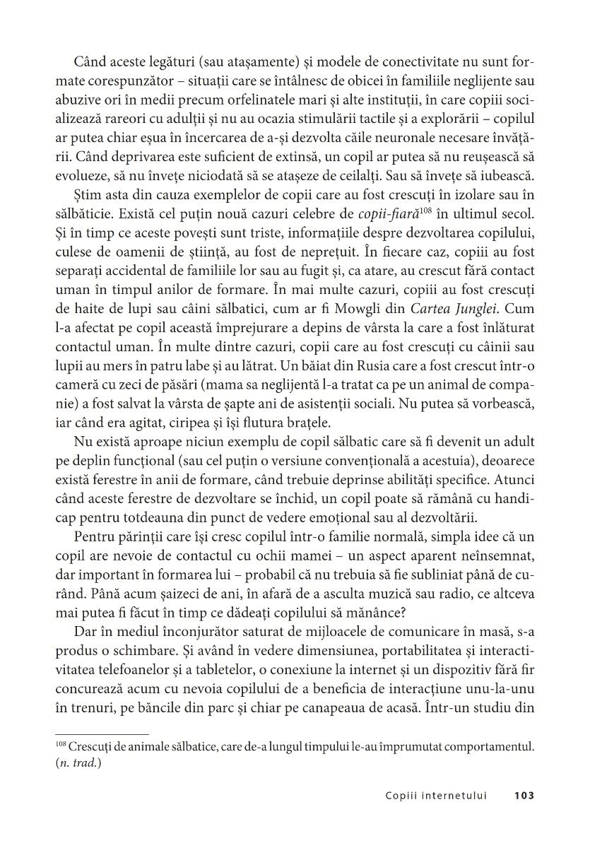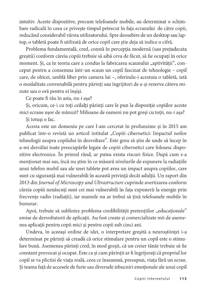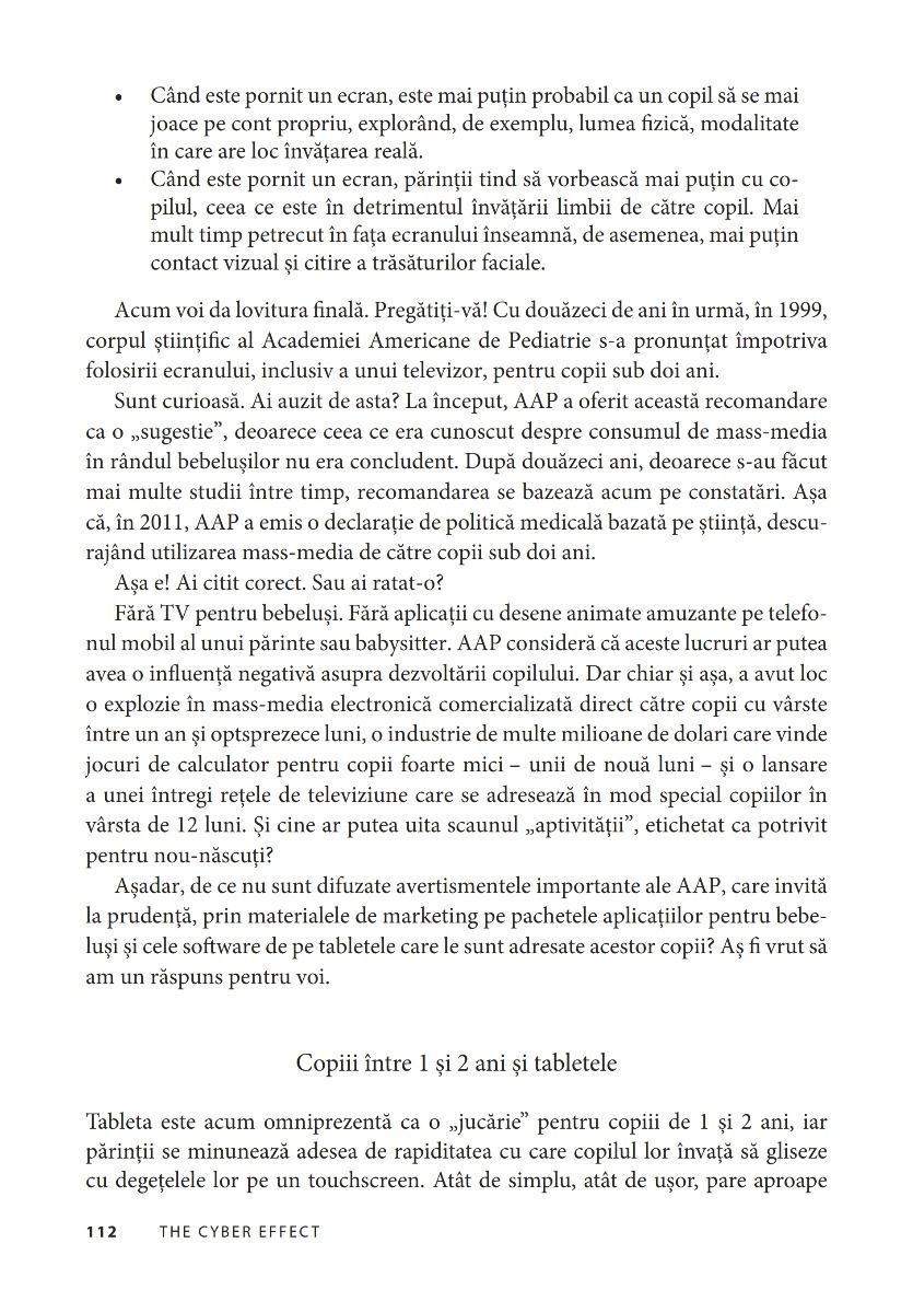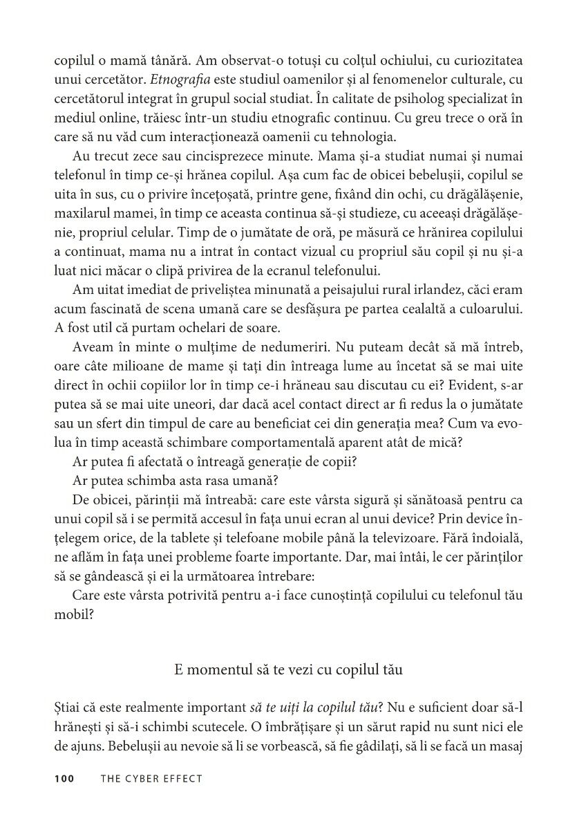 Să descoperi şi să înveţi cum să-ţi ghidezi copiii în această lume ultraconectată este una dintre cele mai mari provocări pentru părinţii din ziua de astăzi. Mary Aiken reuşeşte, în această lucrare, cu mult calm şi claritate, să separe realitatea de mit. Autoarea prezintă în detaliu şi într-un limbaj accesibil problemele pe care trebuie să le rezolvăm cu adevărat şi ne instruieşte cu răbdare despre cum să ne ţinem copiii în siguranţă în noua lor viaţă digitală.
