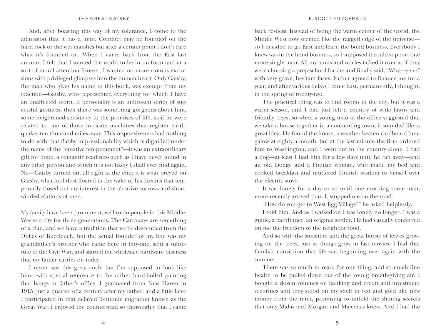When Nick Carraway moves to West Egg, Long Island, he has no idea that the lavishly outfitted mansion next to his modest house is home to Jay Gatsby. Eventually, Nick becomes aware of Gatsby's intense interest in his cousin Daisy Buchanan, and when Daisy's brutish husband, Tom, probes Gatsby's background, he uncovers unsavory revelations about his rival's wealth. First published in 1925, F. Scott Fitzgerald's third novel offers a definitive portrait of the opulence and recklessness of the Jazz Age.