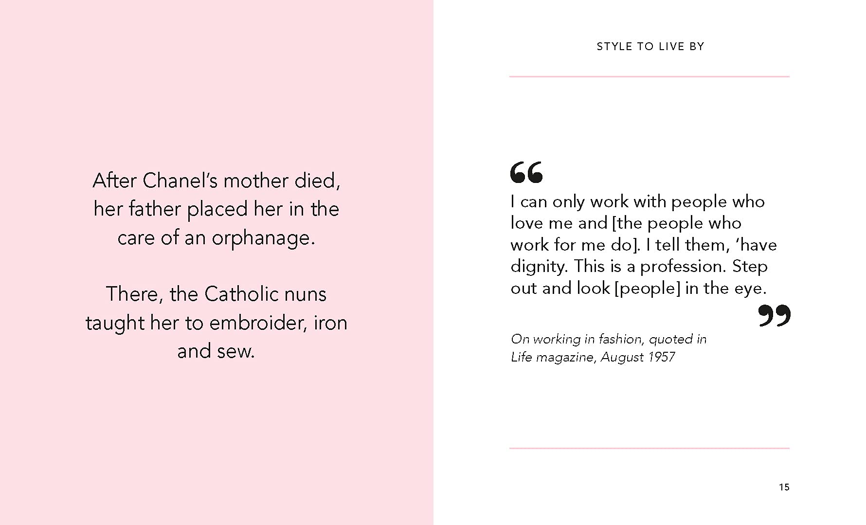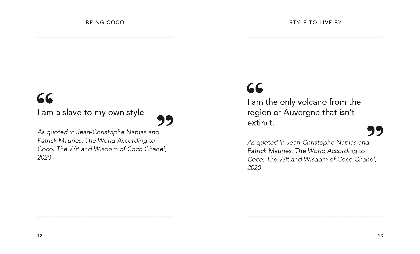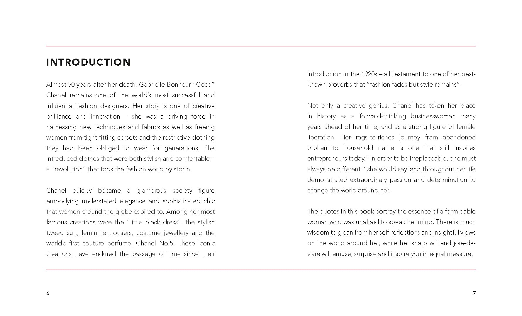 Almost 50 years after her death, Coco Chanel remains one of the world's most influential fashion designers. Her story is one of creative brilliance and innovation - she was a driving force in freeing women from the restrictive clothing they had been obliged to wear for generations. 'In order to be irreplaceable, one must always be different,' Chanel would say, and throughout her life she demonstrated extraordinary passion and determination to change the world around her. There is much wisdom to glean from Chanel's self-reflections, while her sharp wit and joie de vivre will amuse, surprise and inspire in equal measure.