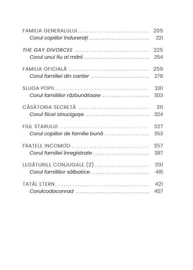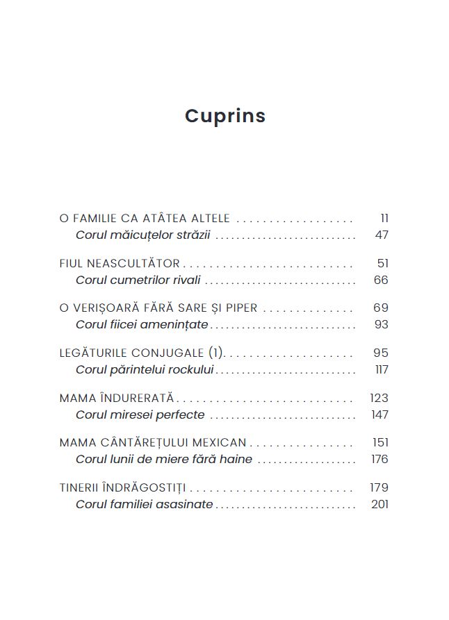 Pornind de la mottoul tolstoian că „Toate familiile fericite seamănă una cu alta, fiecare familie nefericită este nefericită în felul ei“, facem cunoștință rând pe rând cu personaje dintre cele mai pestrițe. O familie nu are nimic de împărțit în afară de singurătate, o mamă vorbește cu ucigașul propriei fiice, o pereche improbabilă își deapănă tinerețea, trei femei se întâlnesc la coșciugul tatălui lor. Toate aceste tablouri și multe altele sunt însoțite de corul mitic care apare între povestiri ca să tragă concluzii dintre cele mai neașteptate și mai crude.