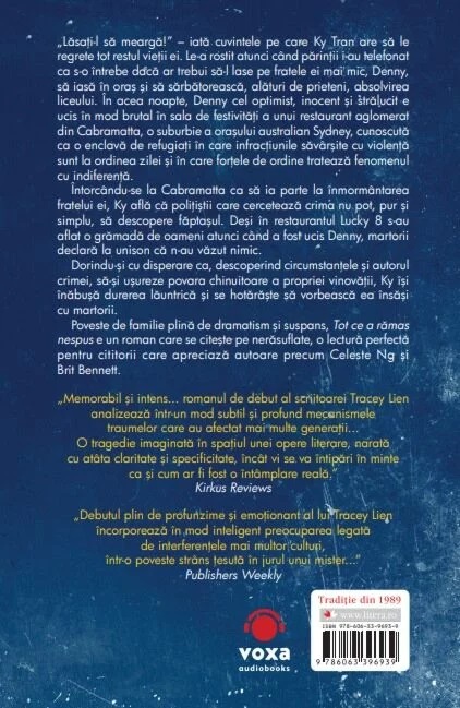 „Acest roman propune o călătorie în timp, purtându-şi cititorii prin Australia plină de frământări a anului 1996, apoi mai adânc în trecut, descriind o copilărie şi o tinereţe modelate de durerile încercate de părinţi, pentru ca apoi să revină la ziua de după comiterea celei mai mari greşeli dintr-o viaţă de om. Povestea imaginată de Tracey Lien coboară în trecut cale de douăzeci de ani, după care îşi readuce cititorii, uluiţi şi cu inimile frânte, în lumina orbitoare a prezentului. Tot ce a rămas nespus e un roman plin de sinceritate şi de tristeţe, dar şi de o frumuseţe copleşitoare. Cu siguranţă că cititorii se vor simţi adânc mişcaţi.” Julia Phillips
