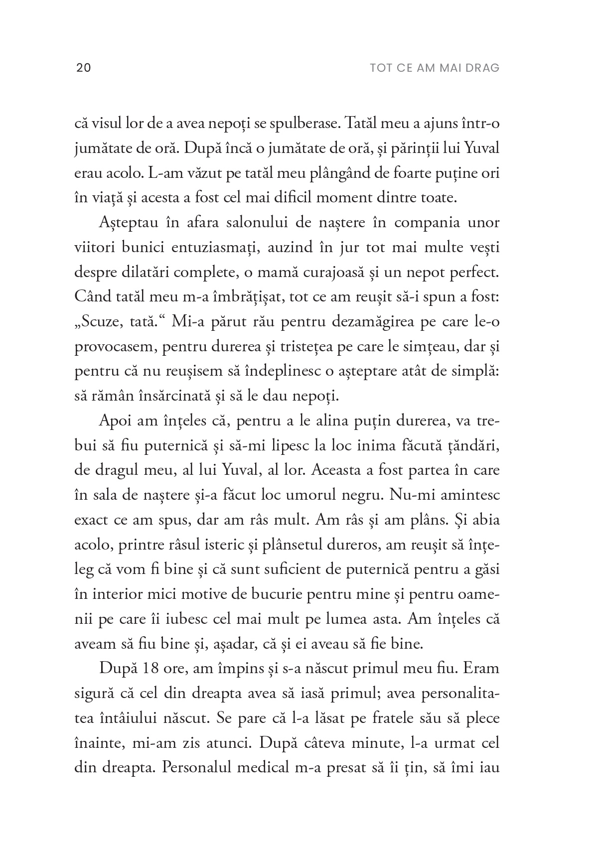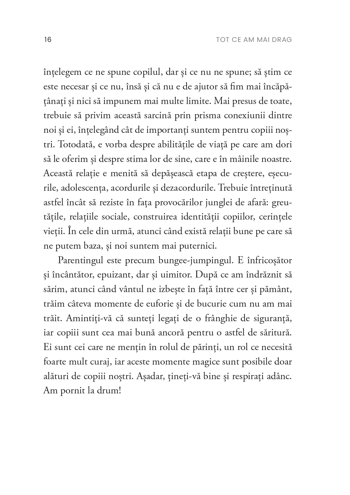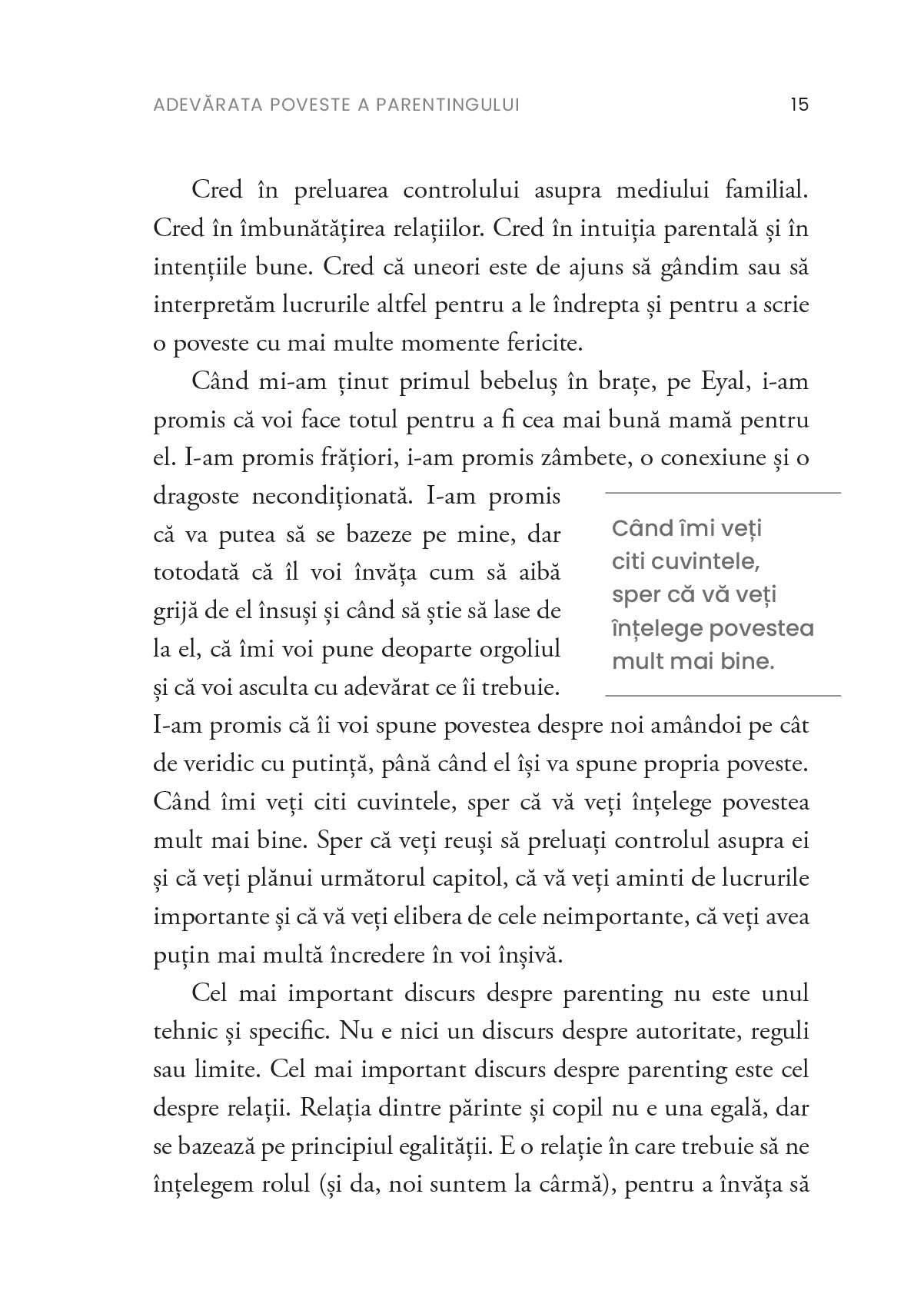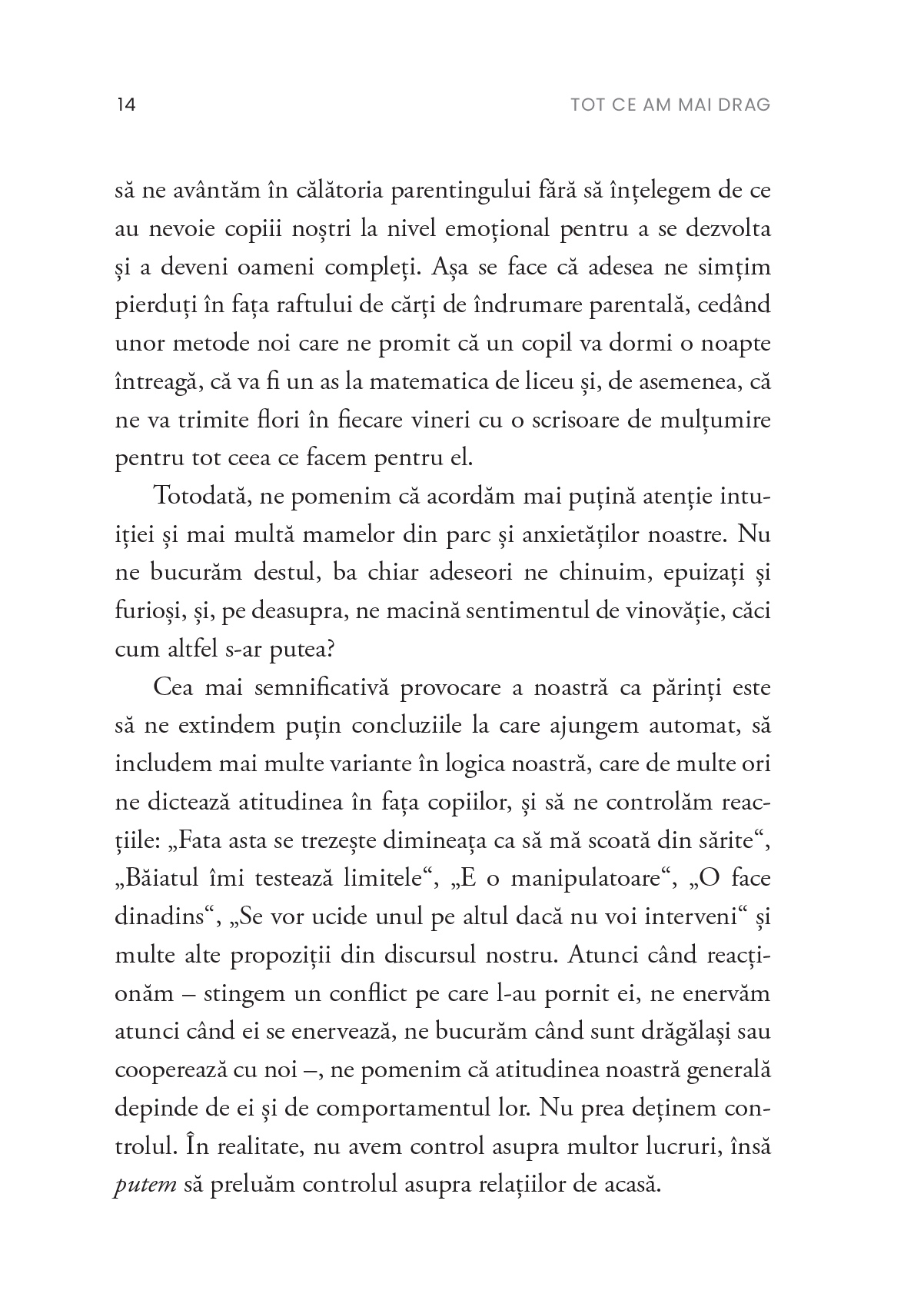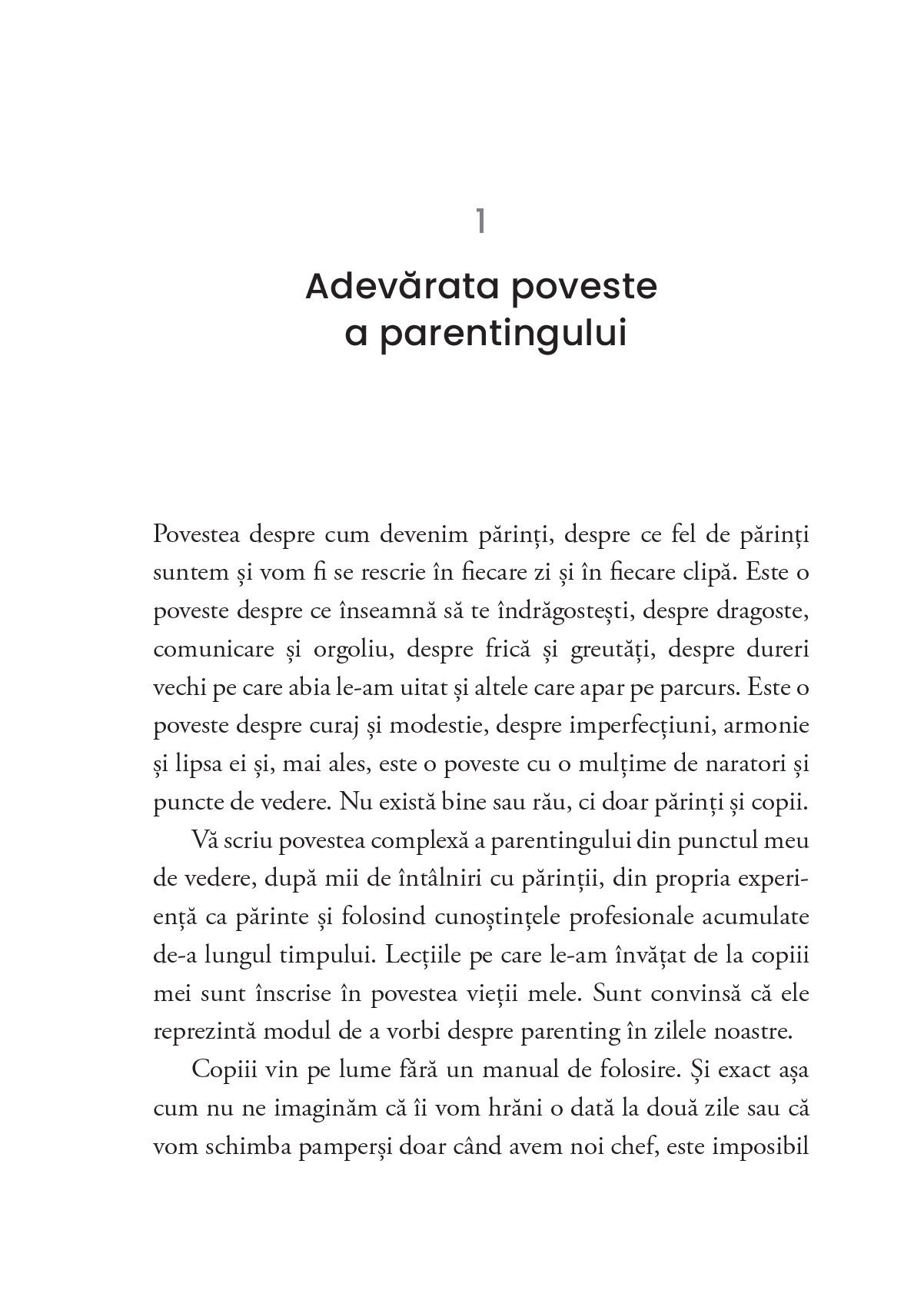 Autoarea ne arată care sunt adevăratele responsabilități ale unui părinte, demontează o parte dintre așteptările și preconcepțiile privind creșterea și educarea celor mici și ne oferă modalități de gestionare a situațiilor bine-cunoscute: cum să nu ne pierdem răbdarea, când trebuie să-și ceară copiii într-adevăr scuze, conflictele dintre frați, cum le formăm stima de sine, provocările pe care le aduce intrarea în adolescență, cum le vorbim despre sexualitate, ce e de făcut cu ecranele și ce măsuri să luăm în cazul bullyingului. În ciuda grijilor și frustrărilor noastre, ca părinți, avem la îndemână un instrument foarte simplu: construirea unei relații apropiate și pline de iubire cu copilul nostru.