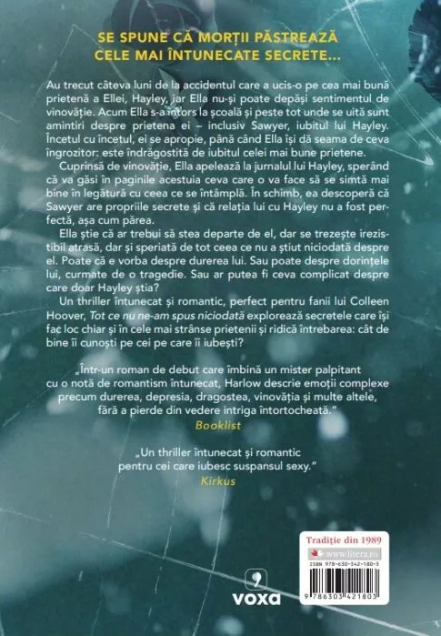 Un thriller întunecat și romantic, perfect pentru fanii lui Colleen Hoover, Tot ce nu ne-am spus niciodată explorează secretele care își fac loc chiar și în cele mai strânse prietenii și ridică întrebarea: cât de bine îi cunoști pe cei pe care îi iubești?