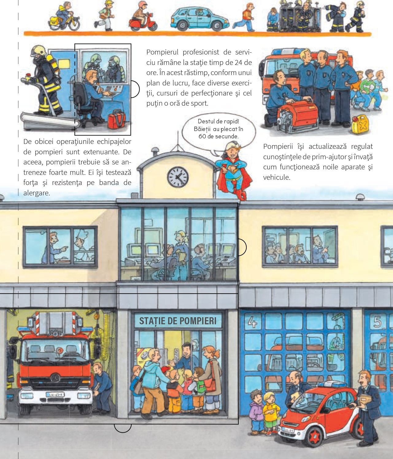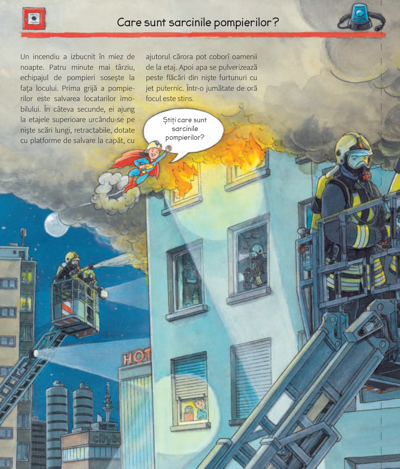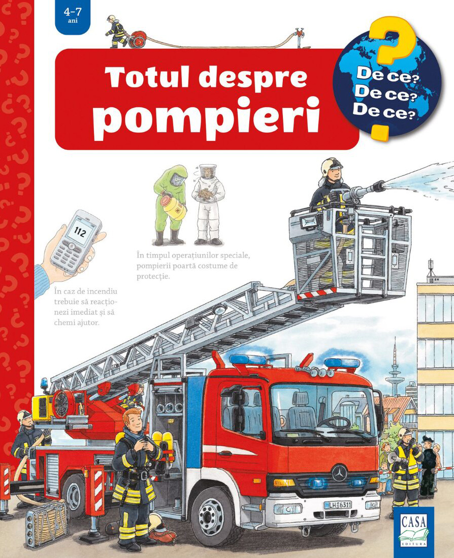 Cu mult curaj și dedicare, pompierii salvează oamenii din case cuprinse în flăcări și sting incendii devastatoare. Cum reușesc să o facă? Ce abilități are un pompier? În ce alte misiuni mai participă? Pompierii sunt un subiect mereu fascinant pentru copiii mai mari sau mai mici, iar o carte care le explică pe îndelete cum e organizată o stație de pompieri, ce instrumente folosesc aceștia în misiuni și cum se desfășoară o stingere de incendiu, îi va încânta fără îndoială!