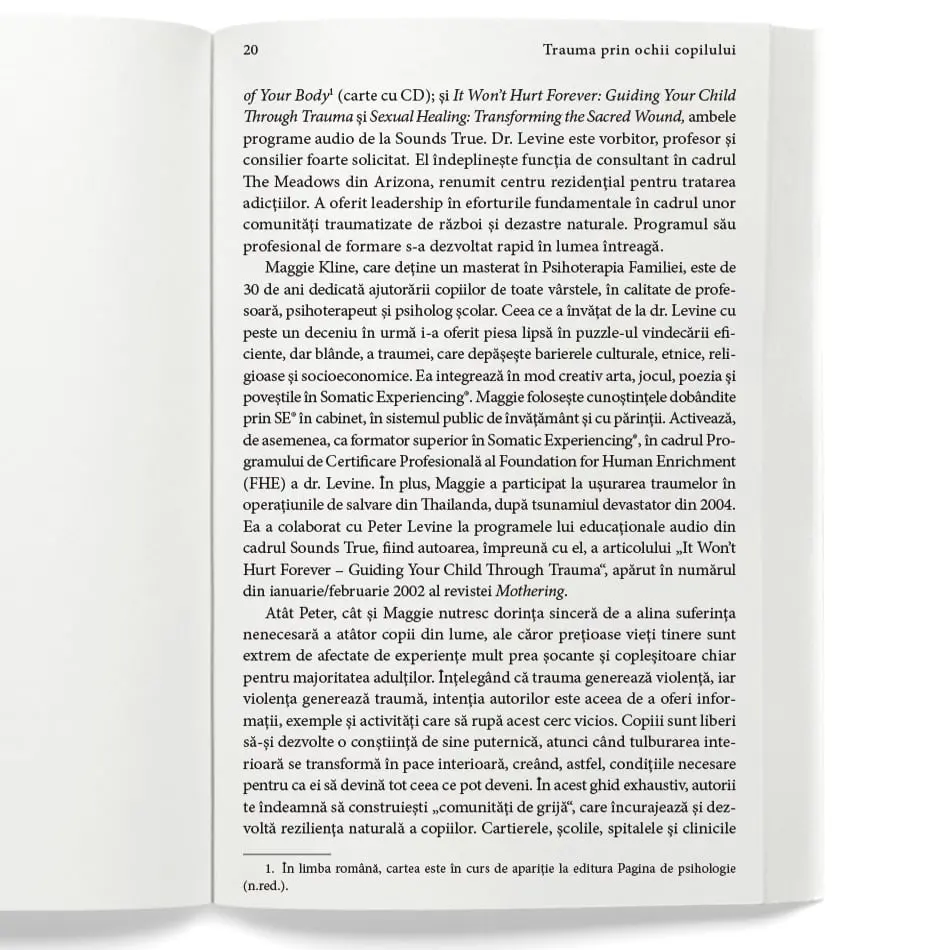 Trauma prin ochii copilului descrie pas cu pas modul în care putem să aplicăm în practică asupra copiilor „primul ajutor emoțional“ în urma accidentărilor și a copleșirii emoționale. Cartea este scrisă pentru publicul larg, cu capitole dedicate în mod special părinților, cadrelor didactice și specialiștilor din domeniul medical.