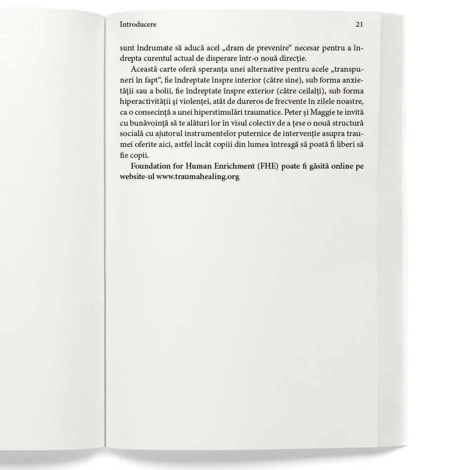 Potrivit autorilor, trauma poate fi provocată de întâmplări catastrofice – abuz și violență –, dar și de unele incidente precum accidente auto minore, proceduri medicale și chirurgicale invazive, divorț, despărțiri sau căzături. Aceste experiențe obișnuite sunt adesea trecute cu vederea, fiind considerate întâmplări banale, și nu se ia în calcul posibilitatea unor consecințe traumatice. Indiferent de cauză, vestea bună este că trauma poate fi nu doar vindecată, ci adeseori chiar prevenită, prin folosirea abilităților pe care le vei afla în această carte.