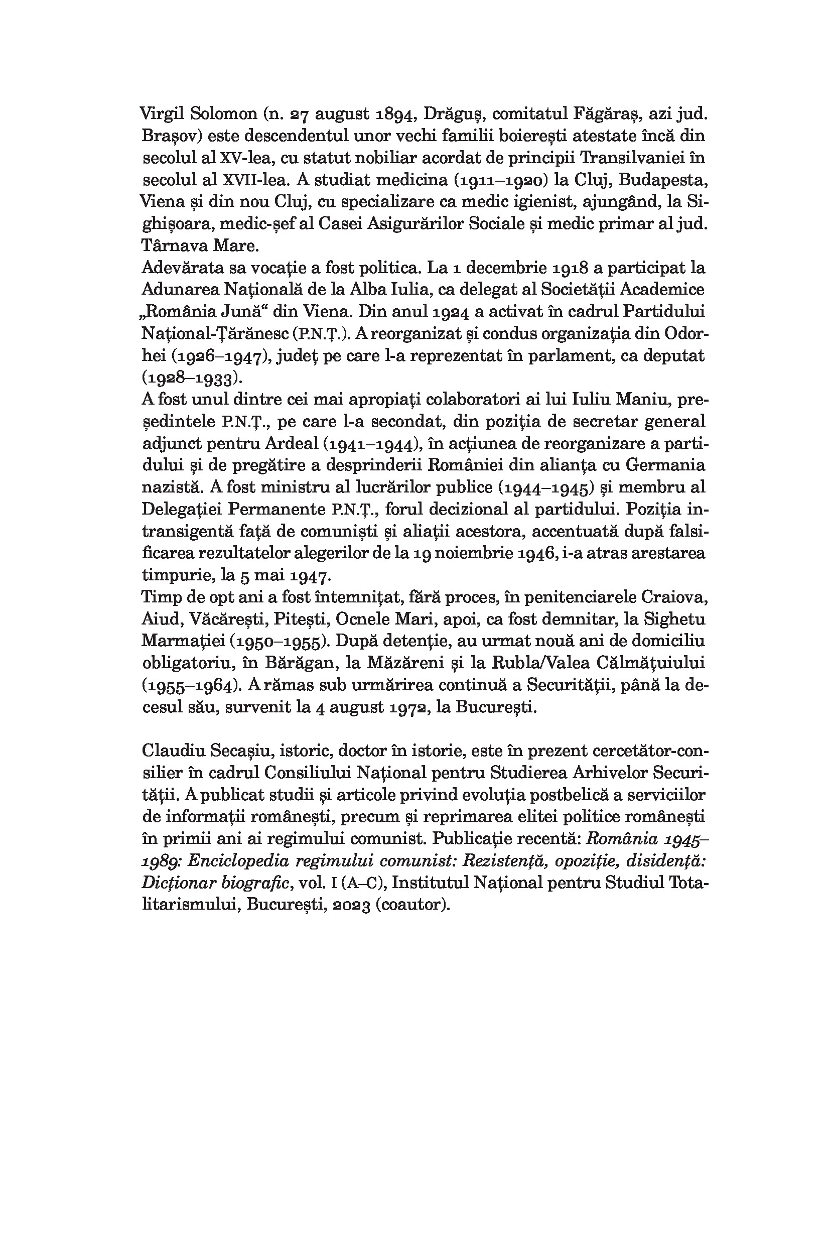 Virgil Solomon (1894–1972), medic de formație, a fost delegat la Adunarea Națională de la Alba Iulia (1918), deputat, ministru, secretar general adjunct al Partidului Național-Țărănesc și un apropiat al lui Iuliu Maniu. A fost urmărit de Siguranță încă din 1937.