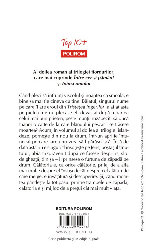 Când pleci să înfrunţi viscolul şi noaptea ca smoala, e bine să mai fie cineva cu tine. Băiatul, singurul nume pe care îl are eroul din Tristeţea îngerilor, a aflat asta pe pielea lui: nu plecase el, devastat după moartea celui mai bun prieten, peste munţii înzăpeziţi să ducă înapoi o carte de la care blândului pescar i se trăsese moartea? Acum, în volumul al doilea al trilogiei islandeze, porneşte din nou la drum, într-un aprilie întunecat pe care iarna nu vrea să-l părăsească. Însă de data asta nu e singur: îl însoţeşte pe Jens, poştaşul ţinutului, abia înzdrăvenit după ce fusese desprins, sloi de gheaţă, din şa – îl prinsese o furtună de zăpadă pe drum. Călătoria e, ca orice călătorie, prilej de a afla mai multe despre el însuşi decât despre cel alături de care merge, e învăţătură şi descoperire. Şi, când moartea pândeşte la tot pasul printre trâmbele de zăpadă, călătoria e şi mijloc de a preţui cât mai mult viaţa.