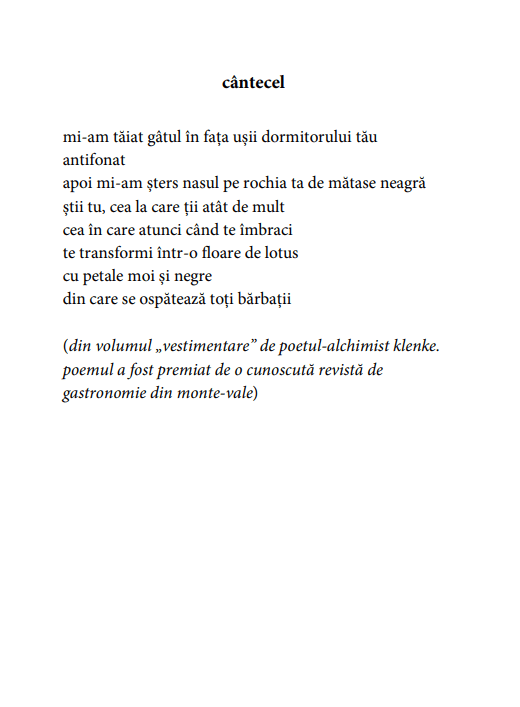 unui van helsing damnat și tenebros, aflat în dialog epistolar cu poetul-alchimist klenke. Două voci limpezi și răscolitoare care trasează destine biografice sinuoase și descriu dintr-o perspectivă existențialist-onirică o realitate ce înfrigurează. Rămâne senzația unei experiențe aproape mistice, cu duioșie și cruzime, în care revelația și ocultarea coexistă, la marginea unui univers rece și