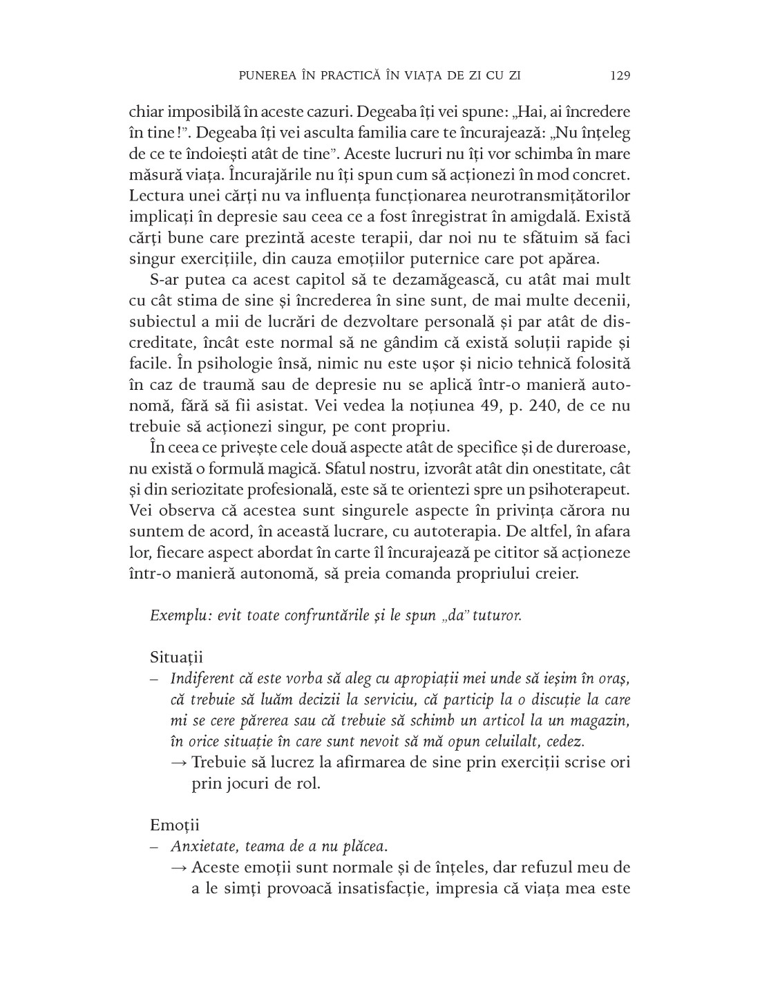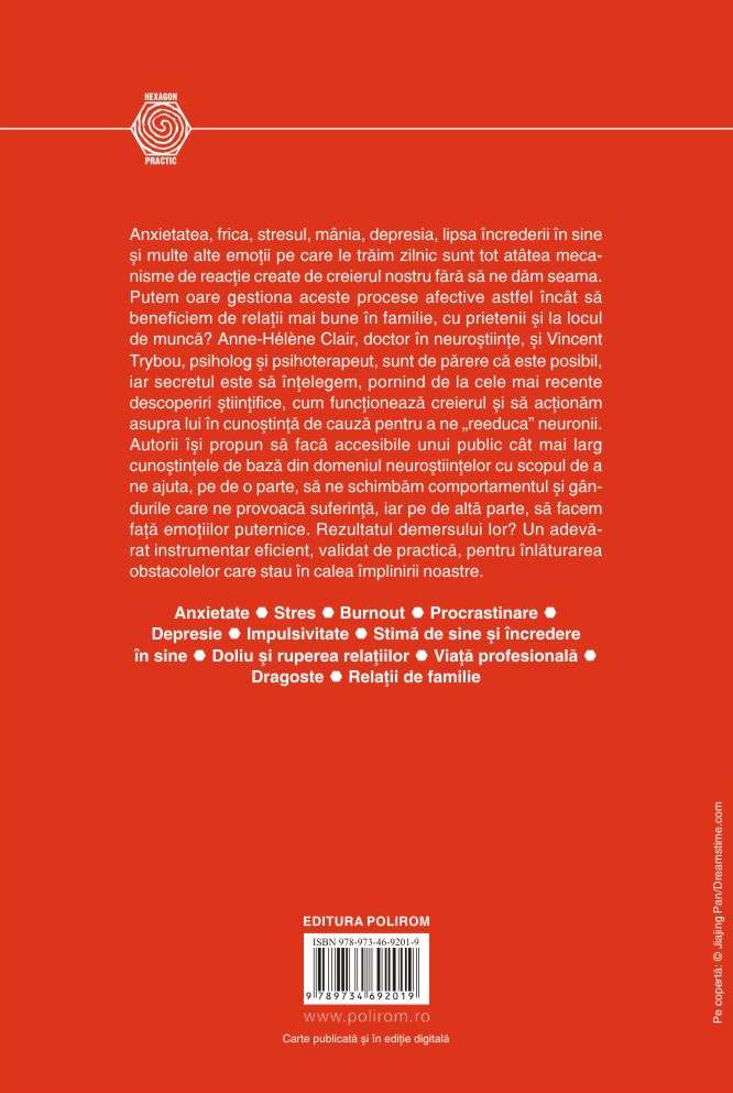 Anxietatea, frica, stresul, mânia, depresia, lipsa încrederii în sine și multe alte emoții pe care le trăim zilnic sunt tot atâtea mecanisme de reacție create de creierul nostru fără să ne dăm seama. Putem oare gestiona aceste procese afective astfel încât să beneficiem de relații mai bune în familie, cu prietenii și la locul de muncă? Anne-Hélène Clair, doctor în neuroștiințe, și Vincent Trybou, psiholog și psihoterapeut, sunt de părere că este posibil, iar secretul este să înțelegem, pornind de la cele mai recente descoperiri științifice, cum funcționează creierul și să acționăm asupra lui în cunoștință de cauză pentru a ne „reeduca” neuronii. Autorii își propun să facă accesibile unui public cât mai larg cunoștințele de bază din domeniul neuroștiințelor cu scopul de a ne ajuta, pe de o parte, să ne schimbăm comportamentul și gândurile care ne provoacă suferință, iar pe de altă parte, să facem față emoțiilor puternice. Rezultatul demersului lor? Un adevărat instrumentar eficient, validat de practică, pentru înlăturarea obstacolelor care stau în calea împlinirii noastre.