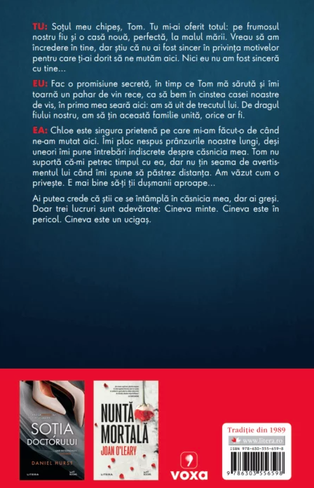Tom nu suportă că-mi petrec timpul cu ea, dar nu țin seama de avertismentul lui când îmi spune să păstrez distanța. Am văzut cum o privește. E mai bine să-ți ții dușmanii aproape... Ai putea crede că știi ce se întâmplă în căsnicia mea, dar ai greși.