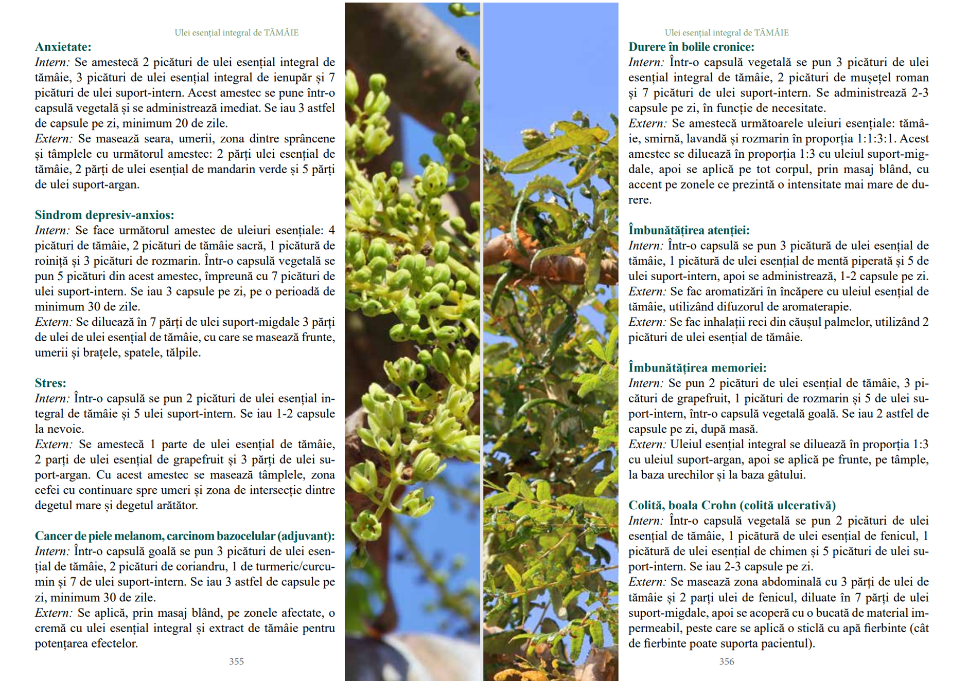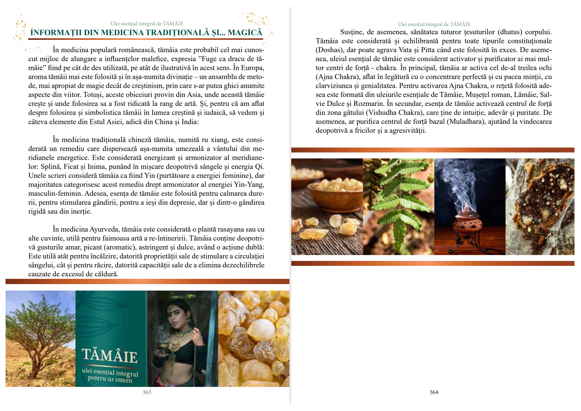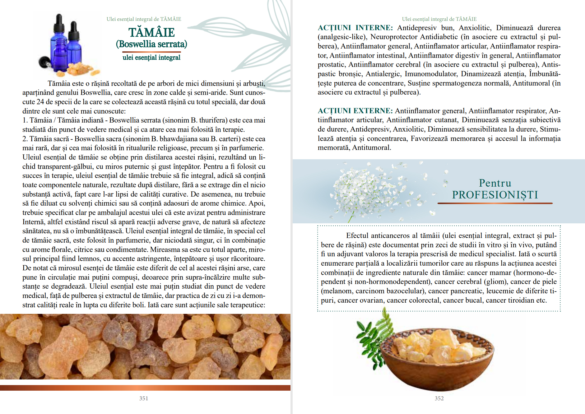 De asemenea, fiecare ulei are prezentate acțiunile interne și externe, informații pentru profesioniști, indicații de dozare în afecțiuni în care efectele benefice au fost dovedite cu studii științifice, precauții și contraindicații și o parte cu informații din medicina tradițională și… magică