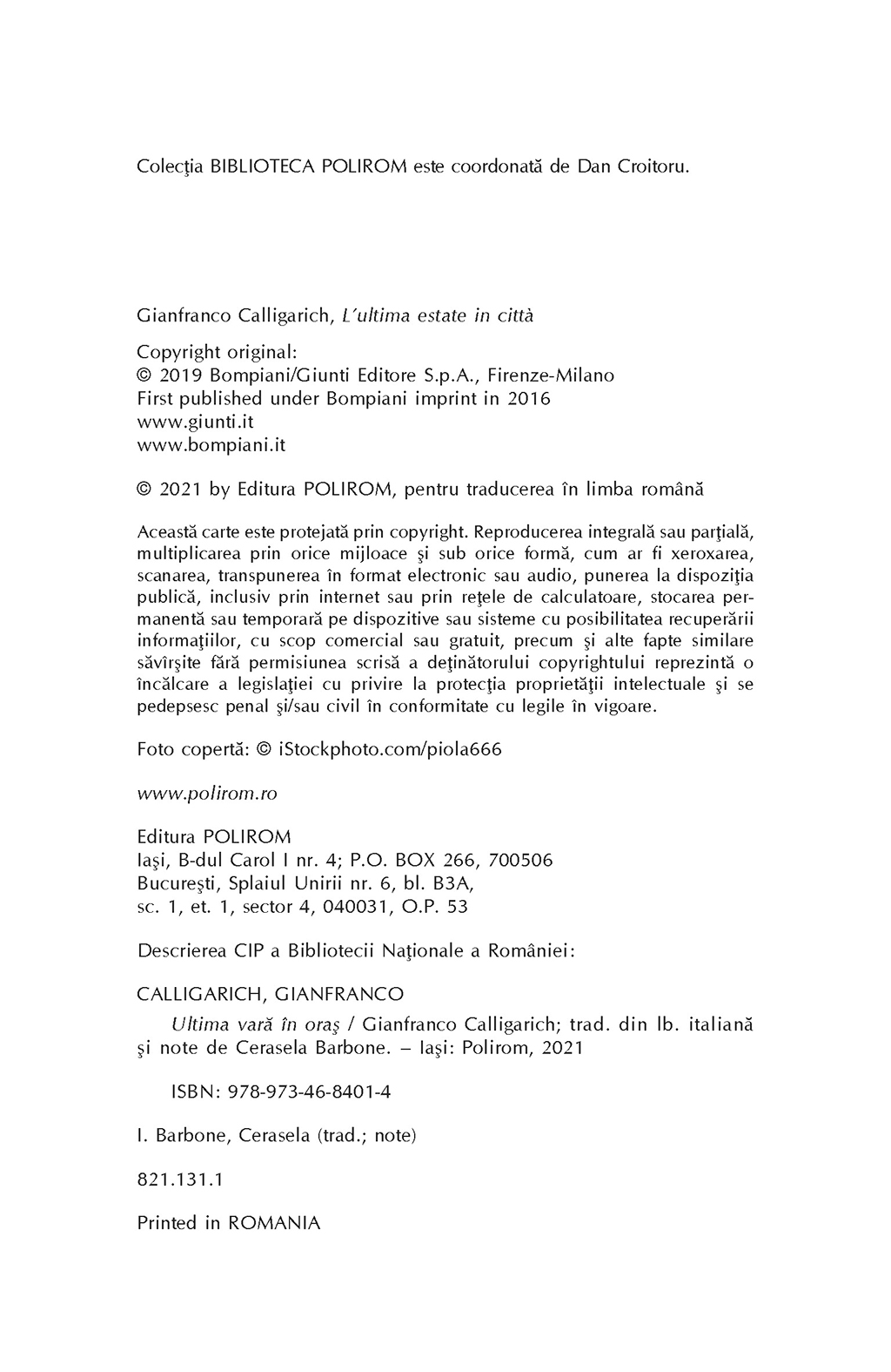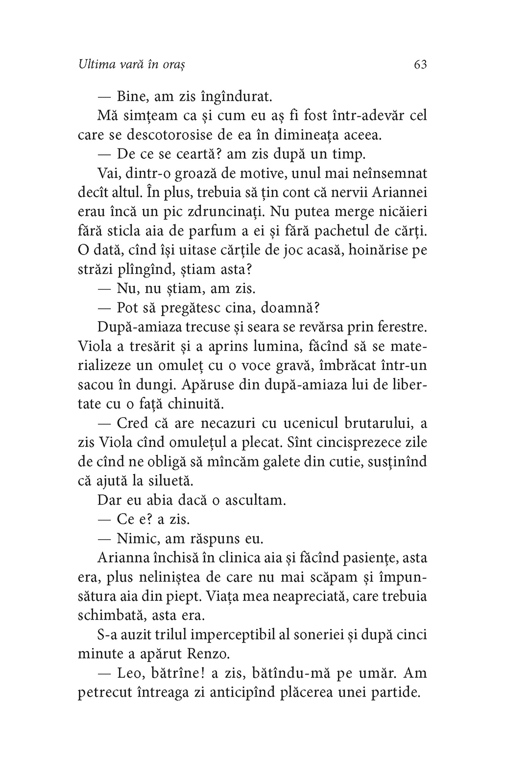 Ultima vară în oraş e un roman al marilor ratări, îmbibat de melancolie, tristeţe şi dezabuzare, în decorul luminos al Romei de la sfîrşitul anilor 1960. Protagonistul său, Leo Gazzarra, a plecat în tinereţe din Milano şi acum trăieşte din expediente, căci îi lipseşte dorinţa de a reuşi, de a parveni într-o lume aparent plină de oportunităţi. Intelectual rafinat, dar lipsit de morgă, cuceritor, dar fără a se implica niciodată prea tare, alcoolic, dar dispus să renunţe la băutură, Leo este un ratat prin opţiune, pentru care ratarea devine o artă. Iar cînd ajunge să o cunoască pe fascinanta Arianna, între cei doi începe o poveste de iubire sfîşietoare, cu avansuri şi ezitări, ca într-un tangou tensionat al dorinţei, al cărei final nu e nici o clipă previzibil. Roman al refuzurilor şi neîmplinirii, al însingurării în mijlocul mulţimii şi al luminoasei frumuseţi romane, Ultima vară în oraş este o carte de excepţie, cu un destin excepţional.