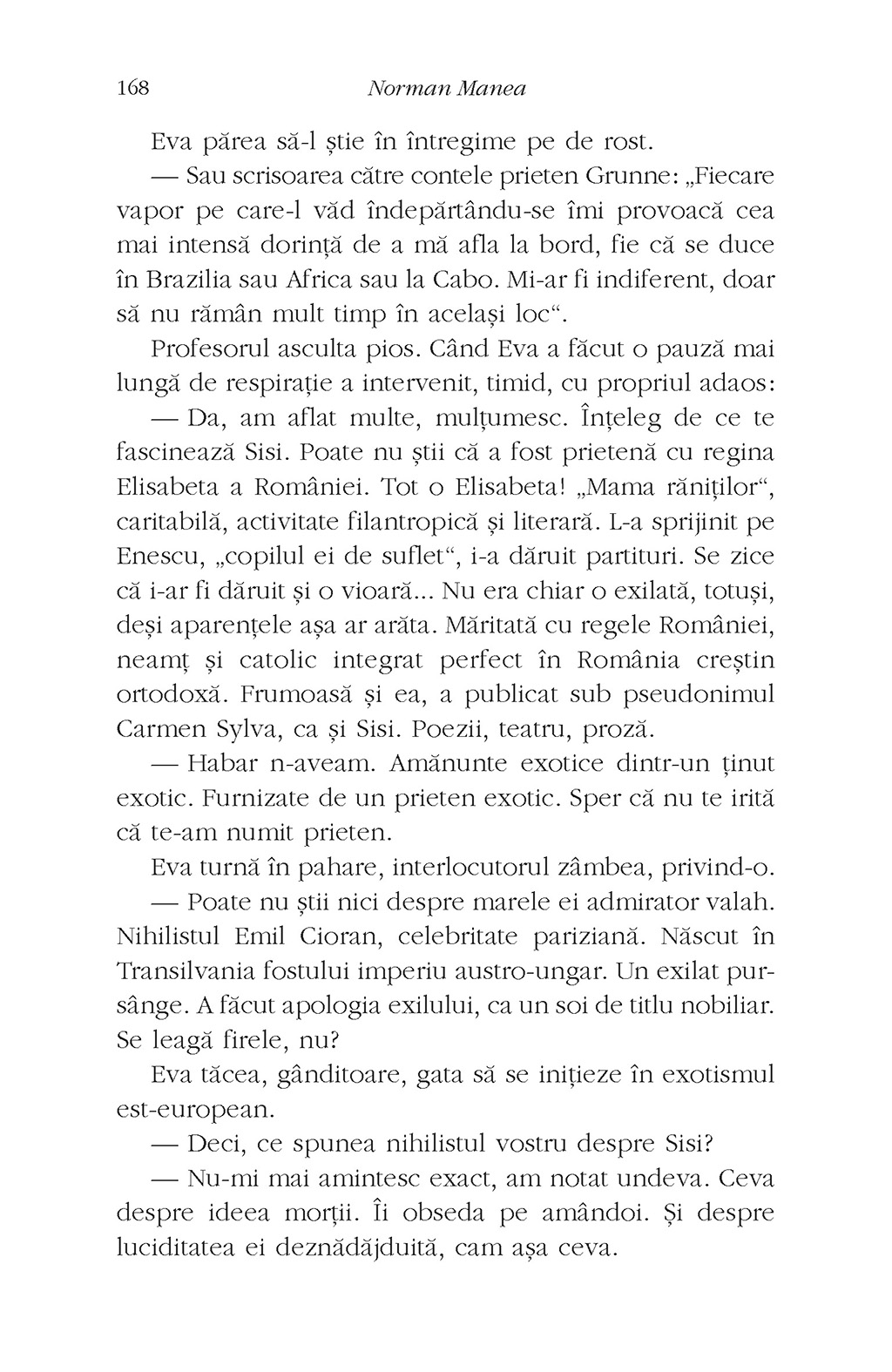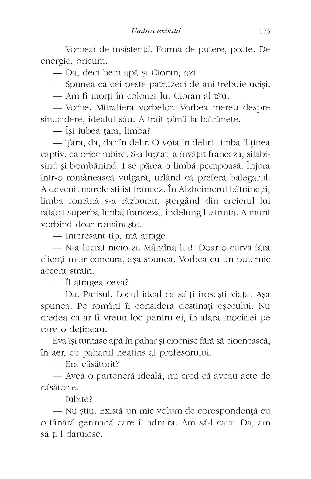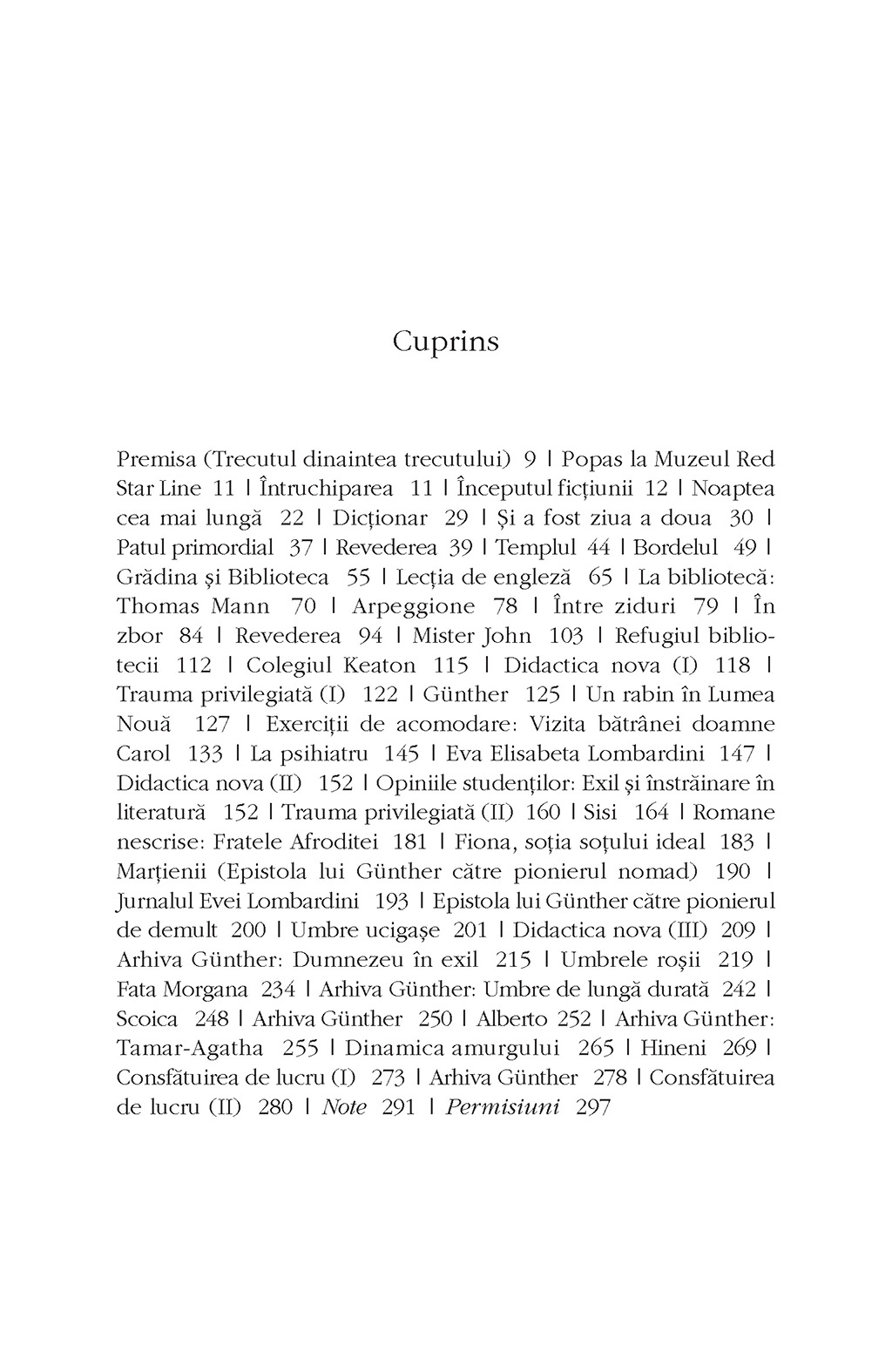 Un roman colaj despre un supraviețuitor al lagărelor din Transnistria, despre existența sa ulterioară într-o dictatură comunistă și exilul în America. Dis-cursul narativ se desfășoară pe mai multe niveluri, fiind potențat cu un colaj de fragmente literare semnificative și însemnări de lectură despre identitate, iubire și literatură.