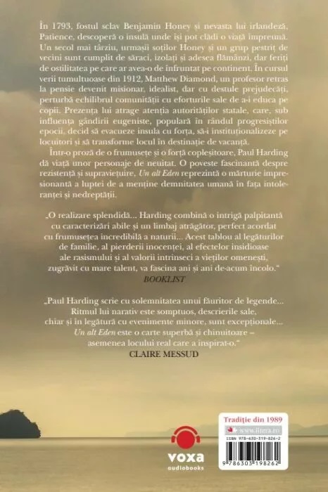 În 1793, fostul sclav Benjamin Honey şi nevasta lui irlandeză, Patience, descoperă o insulă unde îşi pot clădi o viață împreună. Un secol mai târziu, urmaşii soților Honey şi un grup pestriț de vecini sunt cumplit de săraci, izolați şi adesea flămânzi, dar feriți de ostilitatea pe care ar avea-o de înfruntat pe continent. În cursul verii tumultuoase din 1912, Matthew Diamond, un profesor retras la pensie devenit misionar, idealist, dar cu destule prejudecăți, perturbă echilibrul comunității cu eforturile sale de a-i educa pe copii. Prezența lui atrage atenția autorităților statale, care, sub influența gândirii eugeniste, populară în rândul progresiştilor epocii, decid să evacueze insula cu forța, să-i instituționalizeze pe locuitori şi să transforme locul în destinație de vacanță. Într-o proză de o frumusețe şi o forță copleşitoare, Paul Harding dă viață unor personaje de neuitat. O poveste fascinantă despre rezistență şi supraviețuire, Un alt Eden reprezintă o mărturie impresionantă a luptei de a menține demnitatea umană în fața intoleranței şi nedreptății.