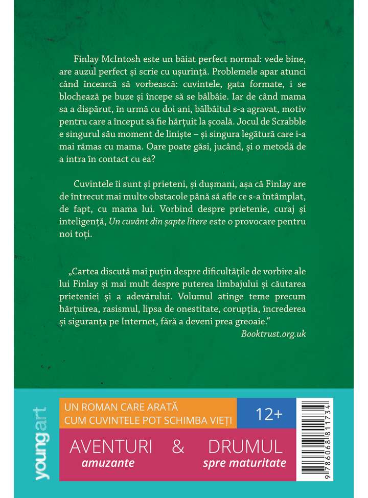 Cuvintele îi sunt și prieteni, și dușmani, așa că Finlay are de întrecut mai multe obstacole până să afle ce s-a intâmplat, de fapt, cu mama lui. Vorbind despre prietenie, curaj și inteligență, Un cuvânt din șapte litere este o provocare pentru noi toți.