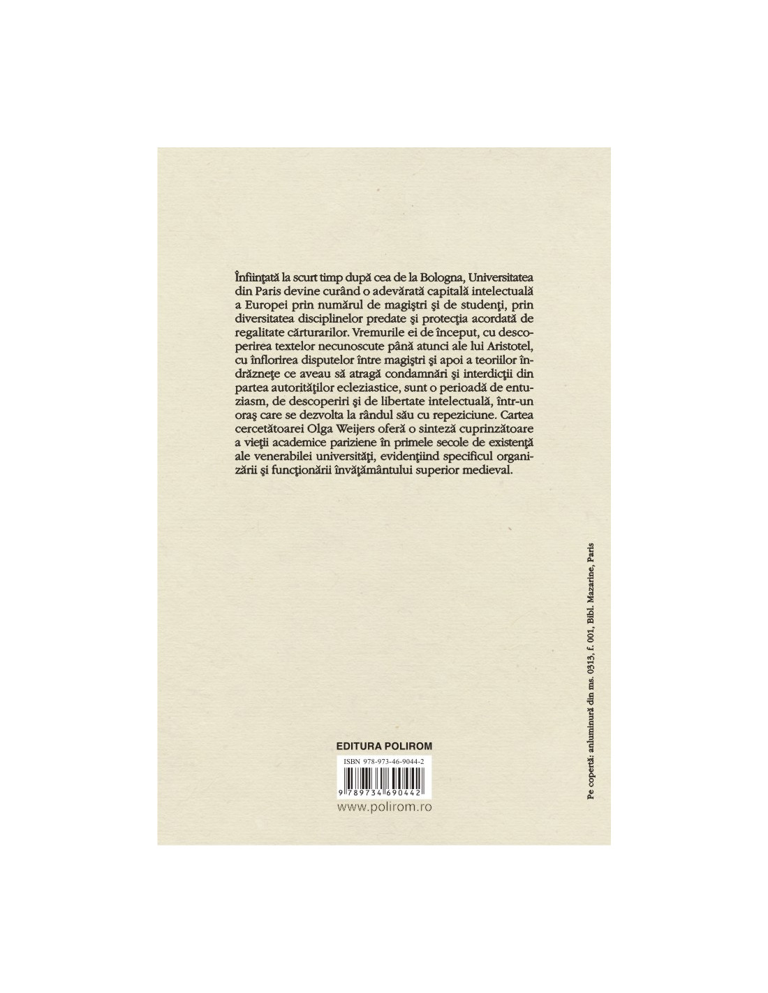 Înființată la scurt timp după cea de la Bologna, Universitatea din Paris devine curând o adevărată capitală intelectuală a Europei prin numărul de magiștri și de studenți, prin diversitatea disciplinelor predate și protecția acordată de regalitate cărturarilor. Vremurile ei de început, cu descoperirea textelor necunoscute până atunci ale lui Aristotel, cu înflorirea disputelor între magiștri și apoi a teoriilor îndrăznețe ce aveau să atragă condamnări și interdicții din partea autorităților ecleziastice, sunt o perioadă de entuziasm, de descoperiri și de libertate intelectuală, într-un oraș care se dezvolta la rândul său cu repeziciune. Cartea cercetătoarei Olga Weijers oferă o sinteză cuprinzătoare a vieții academice pariziene în primele secole de existență ale venerabilei universități, evidențiind specificul organizării și funcționării învățământului superior medieval.