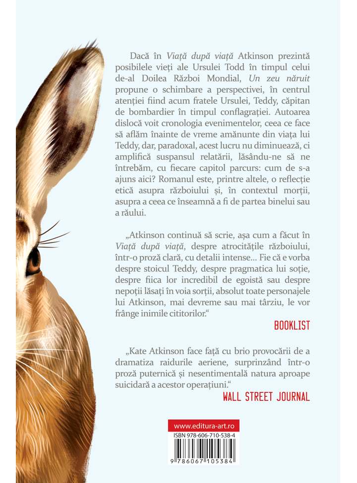 Dacă în Viață după viață Atkinson prezintă posibilele vieți ale Ursulei Todd în timpul celui ce-al Doilea Război Mondial, Un zeu năruit propune o schimbare a perspectivei, în centrul atenției fiind acum fratele Ursulei, Teddy, căpitan de bombardier în timpul conflagrației. Autoarea dislocă voit cronologia evenimentelor, ceea ce face să aflăm înainte de vreme amănunte din viața lui Teddy, dar, paradoxal, acest lucru nu diminuează, ci amplifică suspansul relatării, lăsându-ne să ne întrebăm, cu fiecare capitol parcurs: cum de s-a ajuns aici? Romanul este, printre altele, o reflecție etică asupra războiului și, în contextul morții, asupra a ceea ce înseamnă a fi de partea binelui sau a răului.