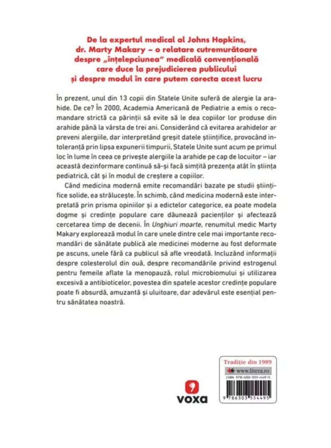 Când medicina modernă emite recomandări bazate pe studii științifice solide, ea strălucește. În schimb, când medicina modernă este interpretată prin prisma opiniilor și a edictelor categorice, ea poate modela dogme și credințe populare care dăunează pacienților și afectează cercetarea timp de decenii. În Unghiuri moarte, renumitul medic Marty Makary explorează modul în care unele dintre cele mai importante recomandări de sănătate publică ale medicinei moderne au fost deformate pe ascuns, unele fără ca publicul să afle vreodată. Incluzând informații despre colesterolul din ouă, despre recomandările privind estrogenul pentru femeile aflate la menopauză, rolul microbiomului și utilizarea excesivă a antibioticelor, povestea din spatele acestor credințe populare poate fi absurdă, amuzantă și uluitoare, dar adevărul este esențial pentru sănătatea noastră.