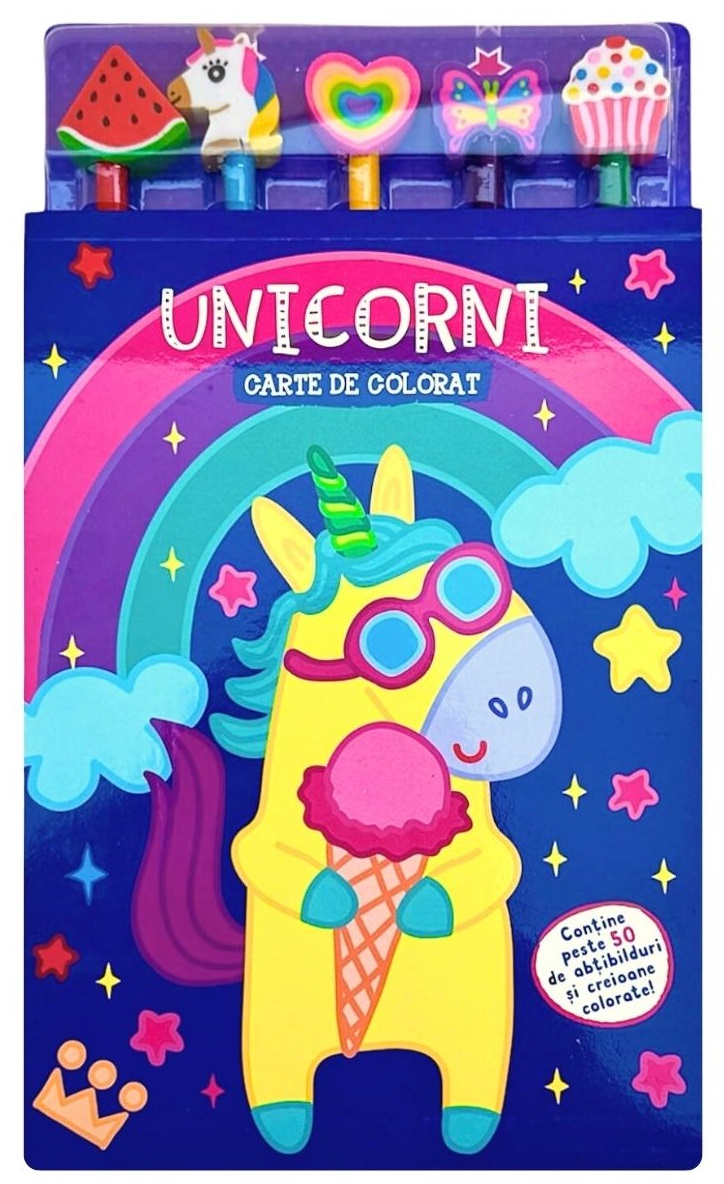 Unicorni. Carte de colorat cu 5 creioane și gume. Conține peste 50 de abțibilduri.
