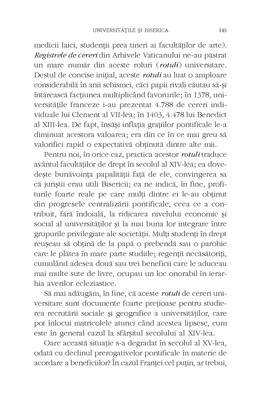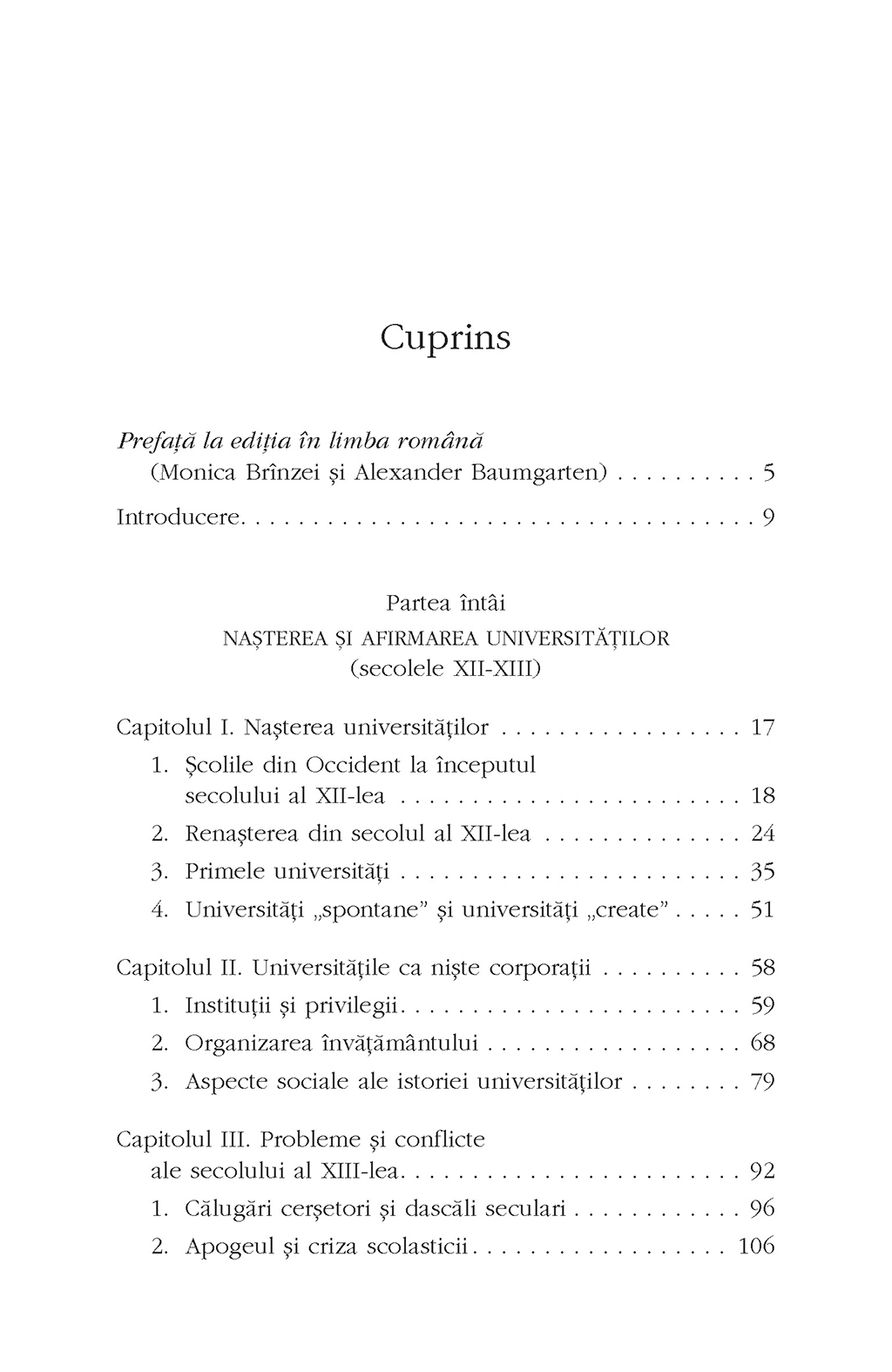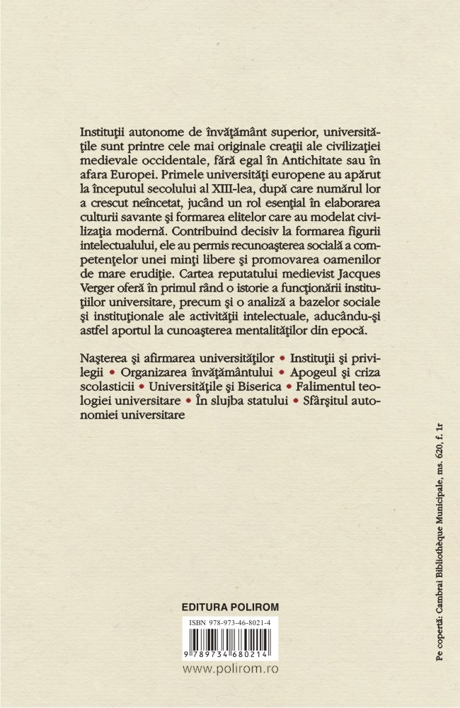 Instituţii autonome de învăţămînt superior, universităţile sînt printre cele mai originale creaţii ale civilizaţiei medievale occidentale, fără egal în Antichitate sau în afara Europei. Primele universităţi europene au apărut la începutul secolului al XIII-lea, după care numărul lor a crescut neîncetat, jucînd un rol esenţial în elaborarea culturii savante şi formarea elitelor care au modelat civilizaţia modernă. Contribuind decisiv la formarea figurii intelectualului, ele au permis recunoaşterea socială a competenţelor unei minţi libere şi promovarea oamenilor de mare erudiţie. Cartea reputatului medievist Jacques Verger oferă în primul rînd o istorie a funcţionării instituţiilor universitare, precum şi o analiză a bazelor sociale şi instituţionale ale activităţii intelectuale, aducîndu-şi astfel aportul la cunoaşterea mentalităţilor din epocă.