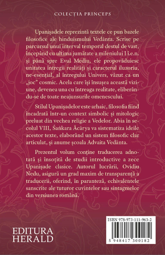 Prezentul volum contine traducerea adnotata si insotita de studii introductive a zece Upanisade clasice. Autorul lucrarii, Ovidiu Nedu, asigura un grad maxim de transparenta a traducerii, oferind, in paranteza, echivalentele sanscrite ale tuturor cuvintelor sau sintagmelor din versiunea romana.