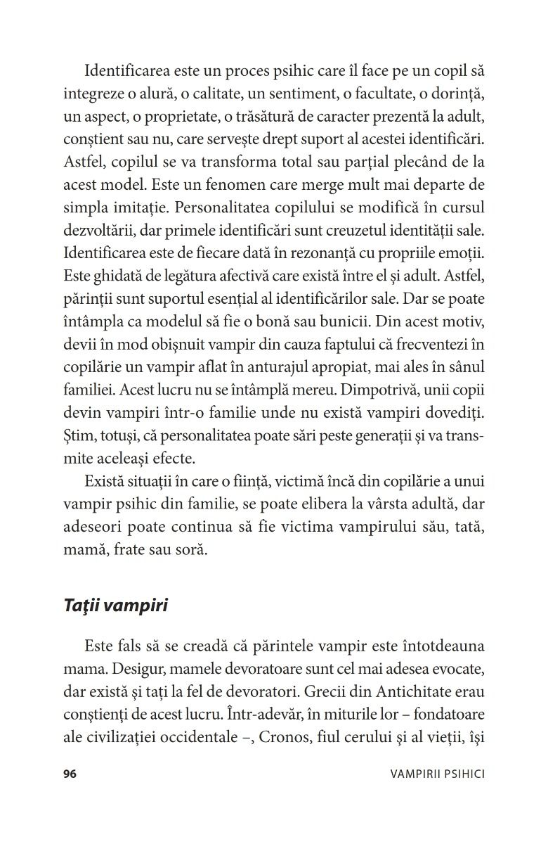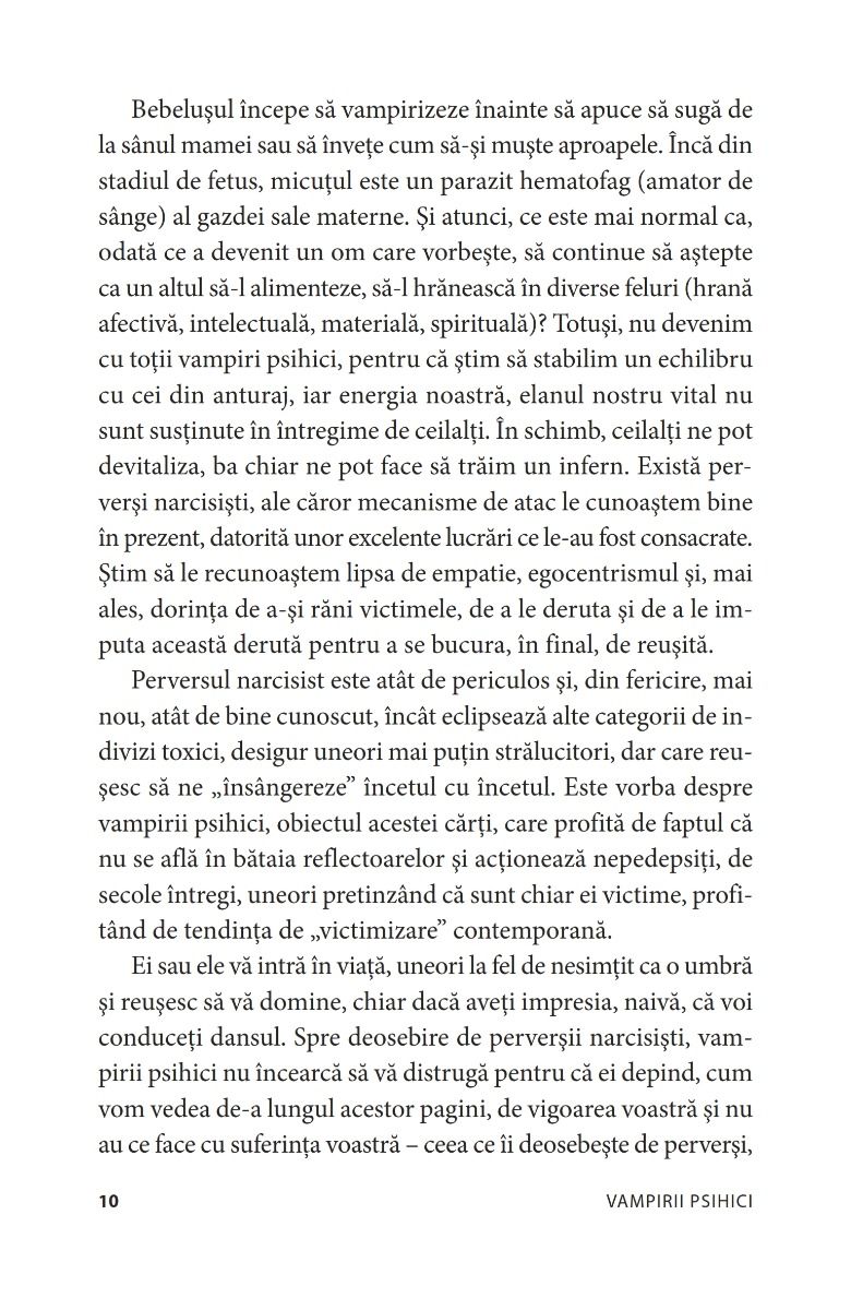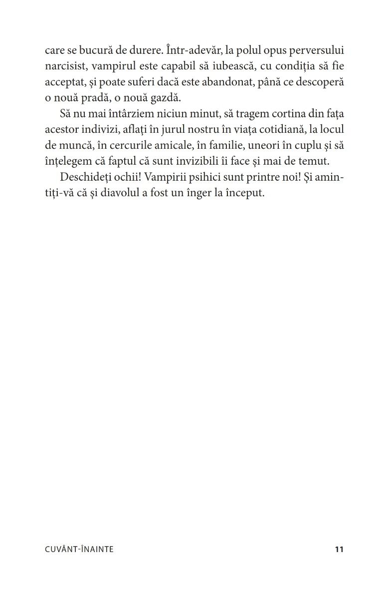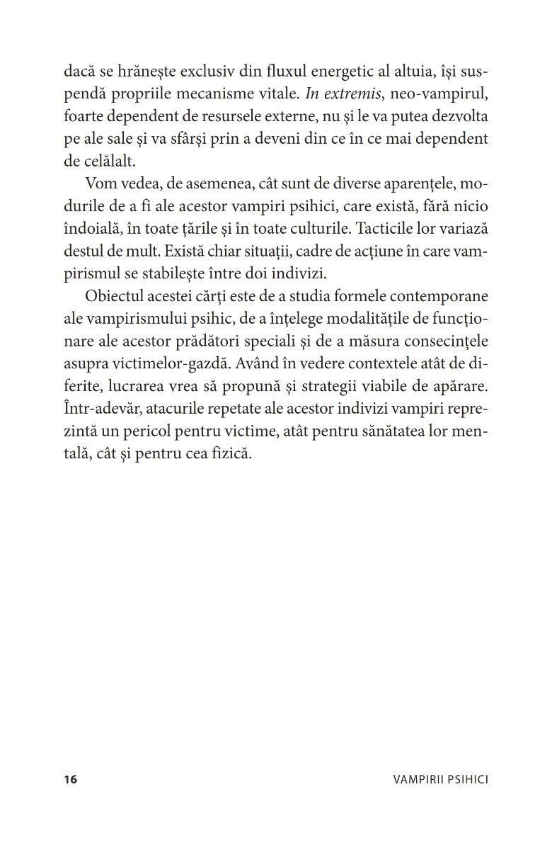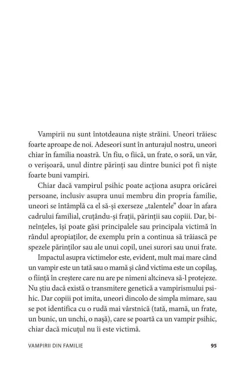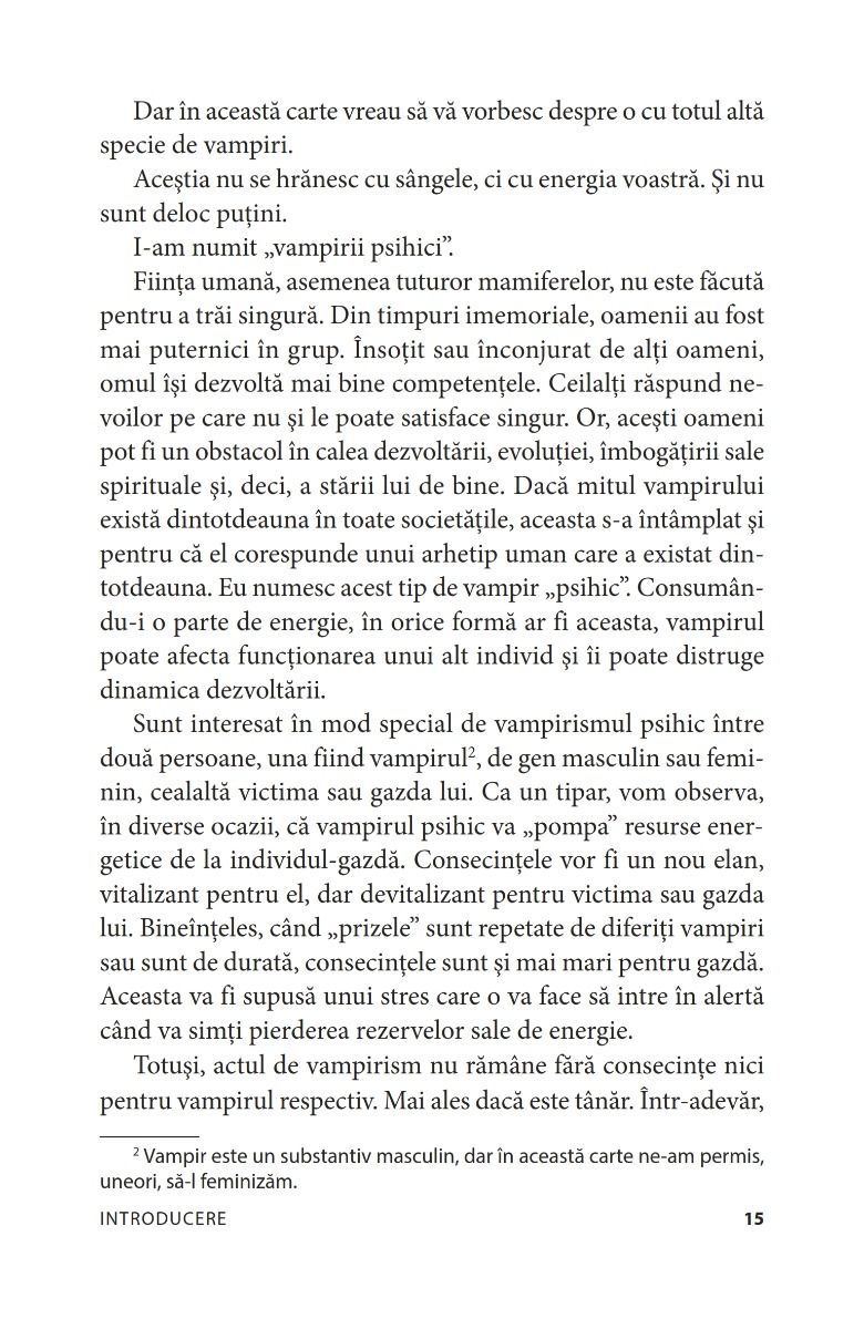 Şi cum ei pot să adopte înfăţişări şi personalităţi foarte diverse, ceea ce face dificilă identificarea lor imediată, din această carte veţi învăţa cum să-i reperaţi, să-i înţelegeţi, să vă protejaţi, dar şi cum să vă daţi seama că puteţi fi voi înşivă un vampir psihic.