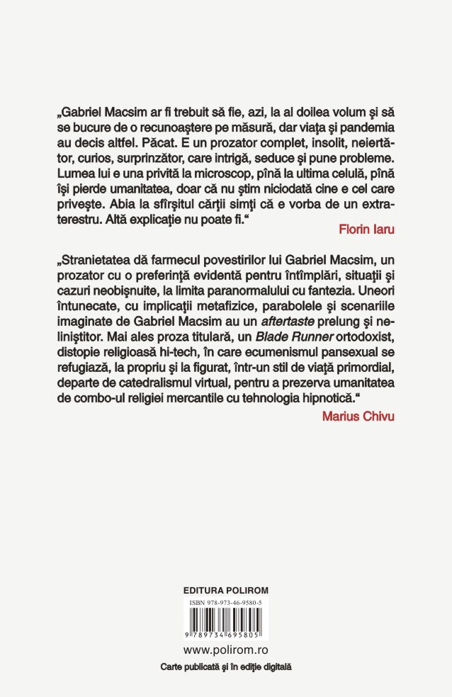 „Stranietatea dă farmecul povestirilor lui Gabriel Macsim, un prozator cu o preferință evidentă pentru întâmplări, situații și cazuri neobișnuite, la limita paranormalului cu fantezia. Uneori întunecate, cu implicații metafizice, parabolele și scenariile imaginate de Gabriel Macsim au un aftertaste prelung și neliniștitor. Mai ales proza titulară, un Blade Runner ortodoxist, distopie religioasă hi-tech, în care ecumenismul pansexual se refugiază, la propriu și la figurat, într-un stil de viață primordial, departe de catedralismul virtual, pentru a prezerva umanitatea de combo-ul religiei mercantile cu tehnologia hipnotică.” (Marius Chivu)