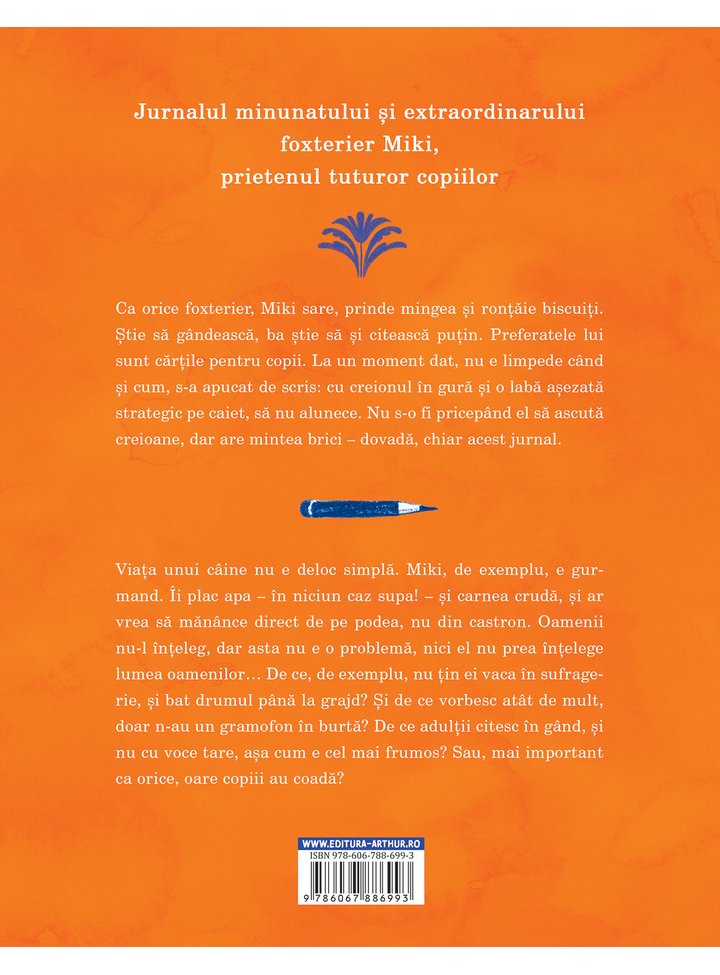 Ca orice foxterier, Miki sare, prinde mingea și ronțăie zahăr. Știe să gândească, ba știe să și citească puțin. Preferatele lui sunt cărțile pentru copii. La un moment dat, nu se știe când și cum, s-a apucat de scris: cu creionul în gură și o labă așezată strategic pe caiet, să nu alunece. N-o fi știind el să ascută creioanele, dar are mintea brici – dovadă, chiar acest jurnal.