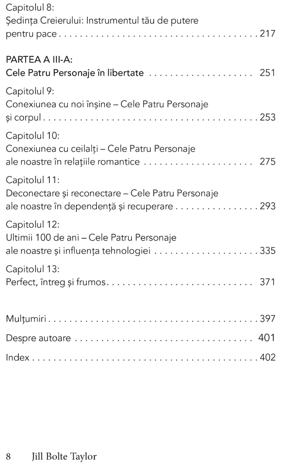 Timp de o jumatate de secol, am fost invatati ca emisfera dreapta a creirerului nostru este creierul emotional, in timp ce emisfera stanga este raspunzatoare pentru gandirea rationala. In prezent, neurostiinta ne demonstreaza ca nu este atat de simplu: de fapt, sistemul nostru limbic este impartit intre cele doua emisfere. In consecinta, fiecare emisfera are atat un creier emotional, cat si unul rational. In aceasta carte inovatoare, dr. Jill Bolte Taylor, autoarea bestseller-ului New York Times, My Stroke of Insight, ne prezinta aceste patru ,,personaje" care ne definesc: