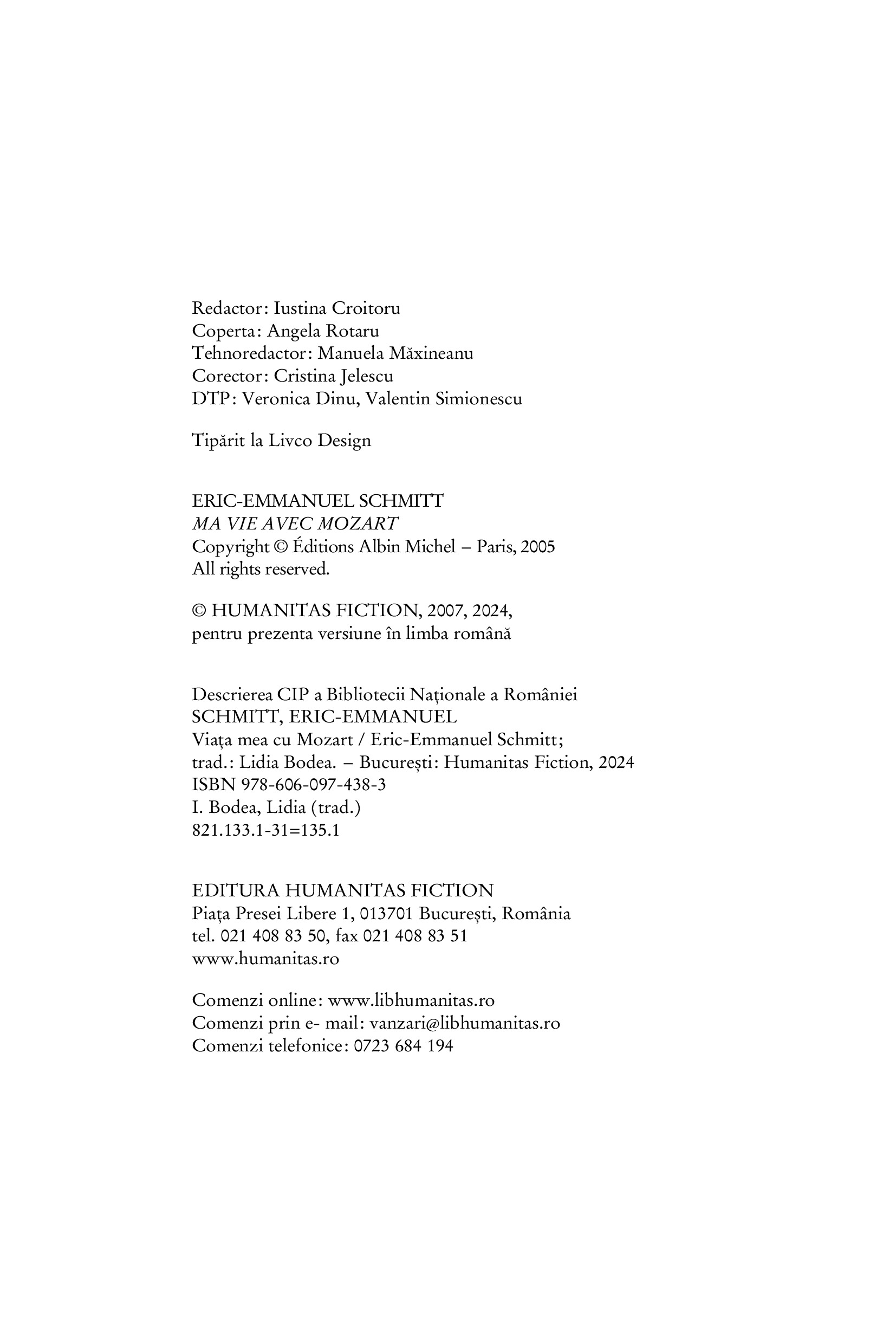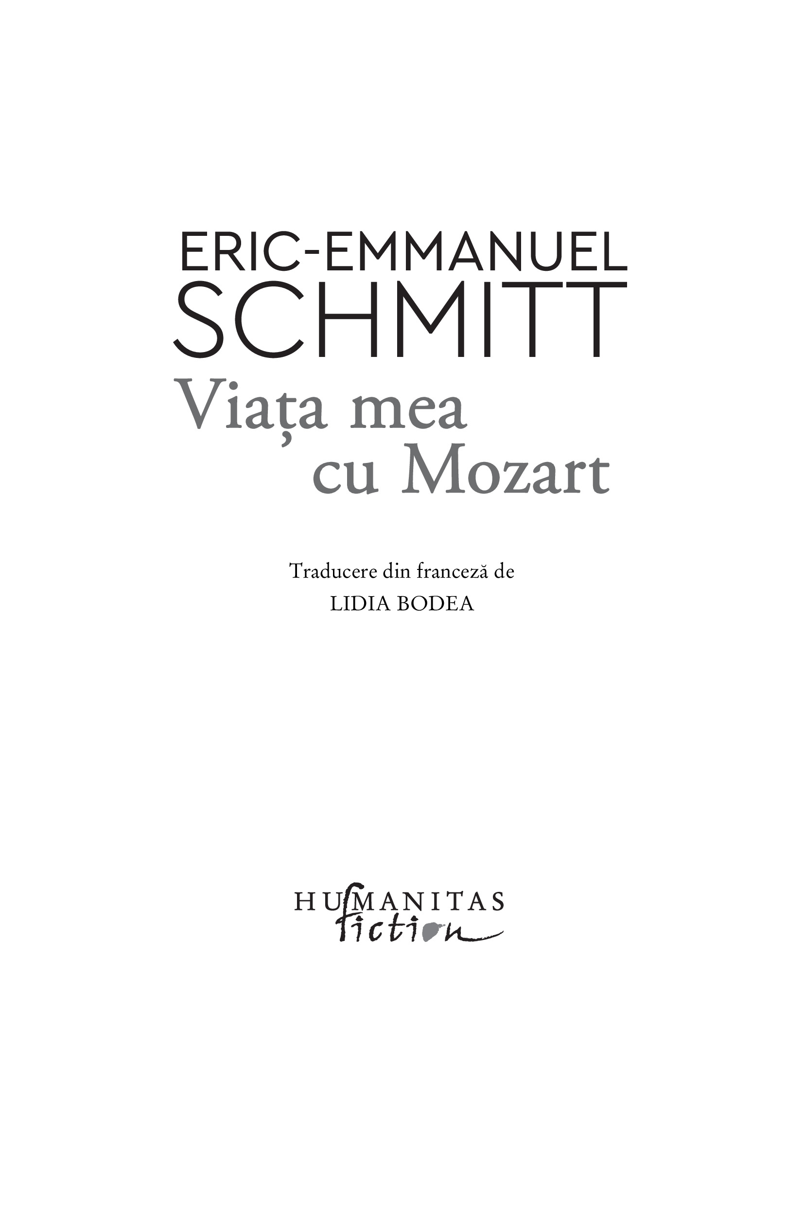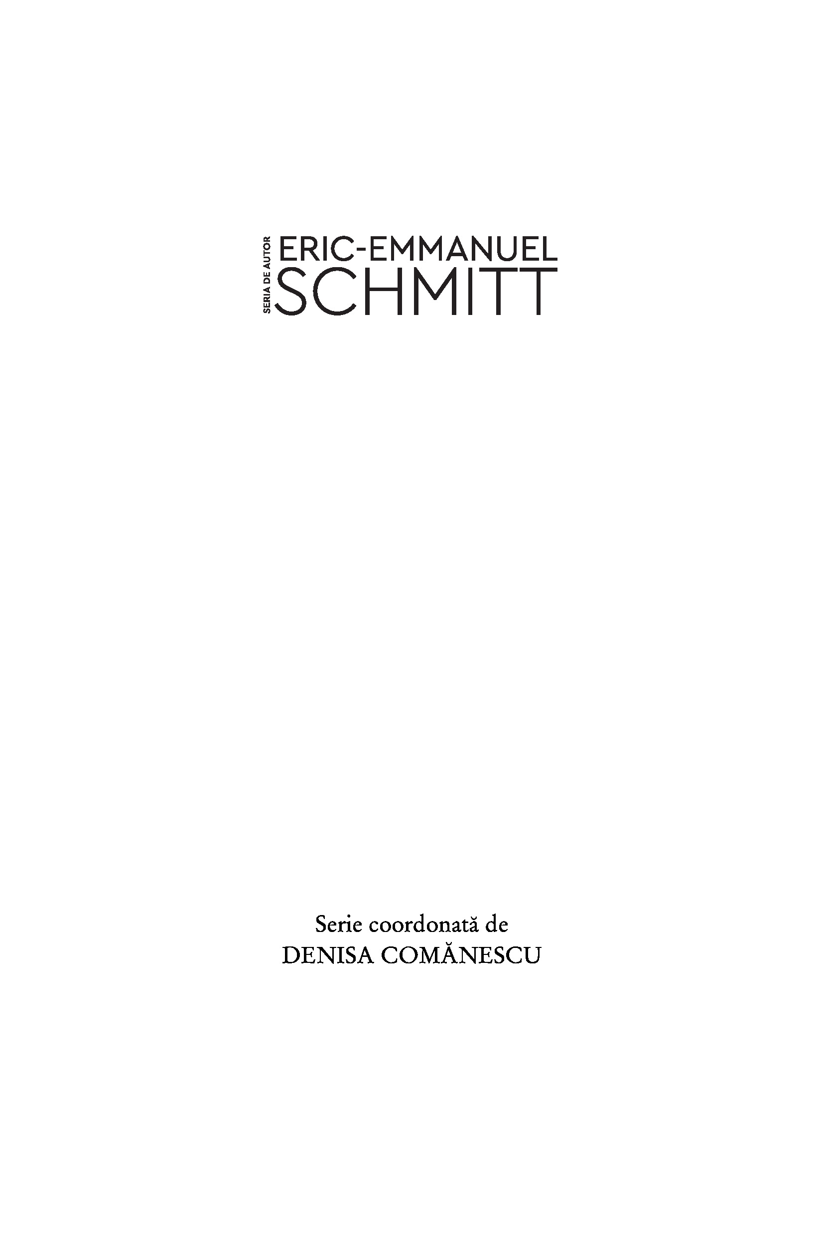 ERIC-EMMANUEL SCHMITT s-a născut pe 28 martie 1960 la Lyon. În 1983 absolvă cursurile prestigioasei École Normale Supérieure cu o diplomă în filozofie. Trei ani mai târziu obține titlul de doctor în filozofie. Debutează în 1991 cu o piesă de teatru, Noaptea de la Valognes. Îi urmează Vizitatorul, care îi aduce consacrarea și pentru care este distins cu trei premii Molière, Variațiuni enigmatice, Libertinul etc. În 1994 îi apare primul roman, Secta Egoiștilor, dar scrie în continuare piese de teatru care fac săli pline în Franța și în străinătate. În 2001 este recompensat de Academia Franceză cu Grand Prix du Théâtre pentru întreaga activitate. De același succes răsunător se bucură și romanele sale Evanghelia după Pilat (2000), Adolf H. Două vieți (2001), Pe când eram o operă de artă (2002), precum și eseul Viața mea cu Mozart (2005). Volumele care alcătuiesc „Ciclul invizibilului“ – Milarepa (1997), Domnul Ibrahim și florile din Coran (2001), Oscar și Tanti Roz (2002), Copilul lui Noe (2004), Luptătorul de sumo care nu se putea îngrășa (2009), Cei zece copii pe care doamna Ming nu i-a avut niciodată (2012), Doamna Pylinska și secretul lui Chopin (2018) și Félix și izvorul invizibil (2019) – s-au aflat luni întregi pe listele de bestselleruri din numeroase țări. Eric-Emmanuel Schmitt este autorul a cinci volume de povestiri, Cea mai frumoasă carte din lume și alte povestiri (2006), Visătoarea din Ostende (2007), Concert în memoria unui înger (2010), distins cu Premiul Goncourt pentru nuvelă, Cei doi domni din Bruxelles (2012) și Răzbunarea iertării (2017). În 2008 publică romanul Ulysse from Bagdad, în 2011, Femeia în fața oglinzii, în 2013, Papagalii din Piața Arezzo, în 2014, dipticul Elixirul dragostei și Otrava iubirii, în 2015, Noaptea de foc, în 2016, Omul care vedea dincolo de chipuri, iar în 2019, Jurnalul unei iubiri pierdute, distins în 2020 cu Premiul Jules Renard. În 2021 apare primul roman, Paradisuri pierdute, din ciclul Străbătând secolele, iar în 2022, următoarele două, Poarta cerului și Soare întunecat. În 2023 publică Provcarea Ierusalimului, un jurnal de călătorie în Țara Sfântă, cu postfața semnată de Papa Francisc. Lui Eric-Emmanuel Schmitt i s-au decernat peste 20 de premii și distincții literare, în 2001 primind titlul de Chevalier des Arts et des Lettres. Cărțile lui sunt traduse în peste 40 de limbi.