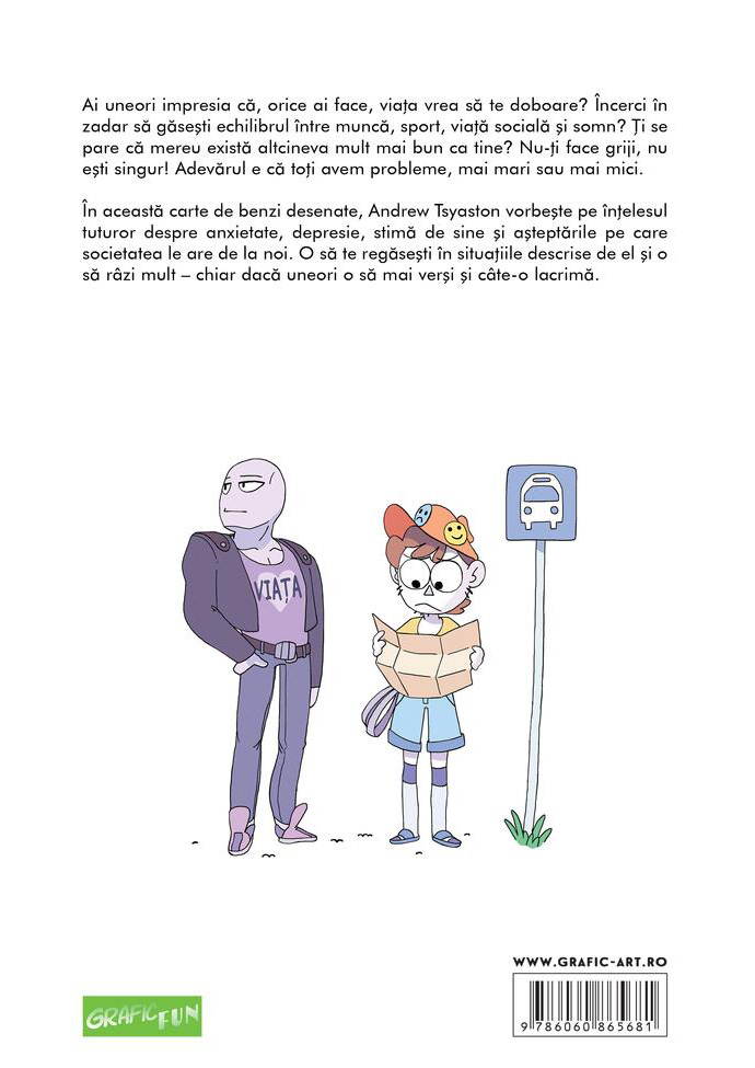 În această carte de benzi desenate, Andrew Tsyaston vorbește pe înțelesul tuturor despre anxientate, depresie, stimă de sine și așteptările pe care societatea le are de la noi. O să te regăsești în situațiile descrise de el și o să râzi mult - chiar dacă uneori o să mai verși și câte-o lacrimă.