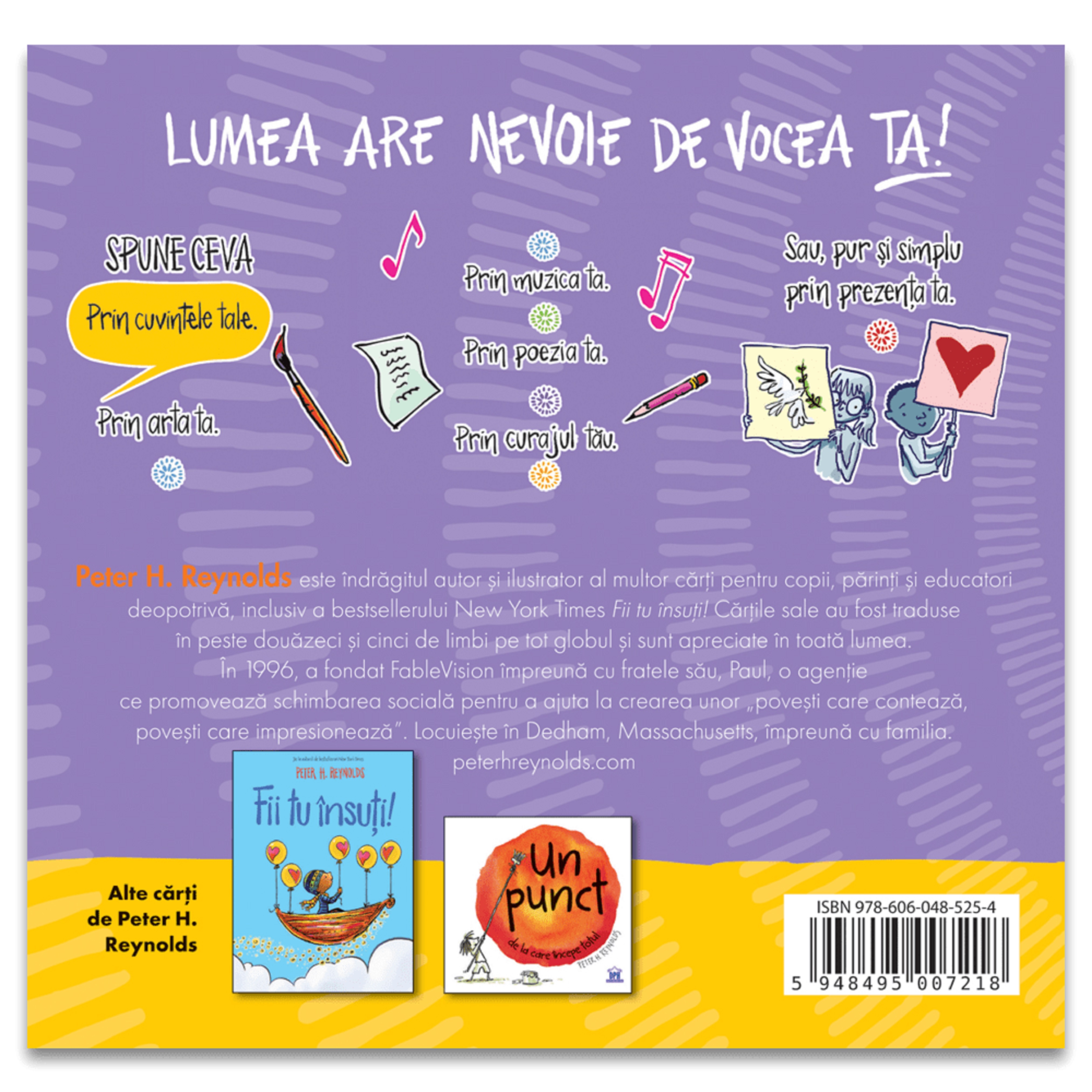 În această nouă carte ilustrată, îndrăgitul autor Peter H. Reynolds explorează numeroasele moduri în care o singură voce poate face diferența. Fiecare dintre noi, în fiecare zi, avem șansa de a spune ceva: prin acțiunile și cuvintele noastre.