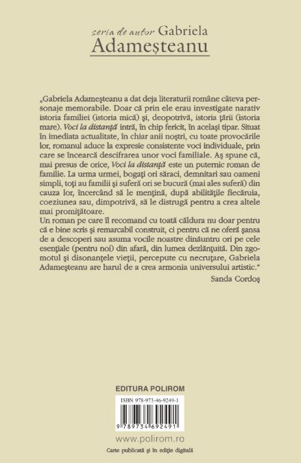 „Gabriela Adameșteanu a dat deja literaturii române câteva personaje memorabile. Doar că prin ele erau investigate narativ istoria familiei (istoria mică) și, deopotrivă, istoria țării (istoria mare). Voci la distanță intră, în chip fericit, în același tipar. Situat în imediata actualitate, în chiar anii noștri, cu toate provocările lor, romanul aduce la expresie consistente voci individuale, prin care se încearcă descifrarea unor voci familiale. Aș spune că, mai presus de orice, Voci la distanță este un puternic roman de familie. La urma urmei, bogați ori săraci, demnitari sau oameni simpli, toți au familii și suferă ori se bucură (mai ales suferă) din cauza lor, încercând să le mențină, după abilitățile fiecăruia, coeziunea sau, dimpotrivă, să le distrugă pentru a crea altele mai promițătoare.