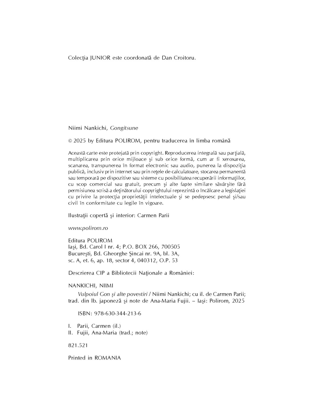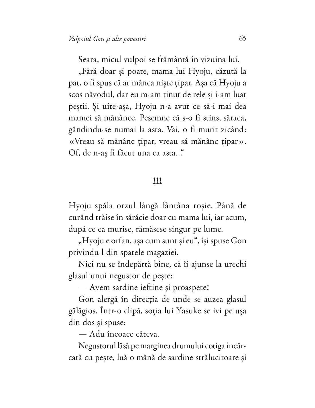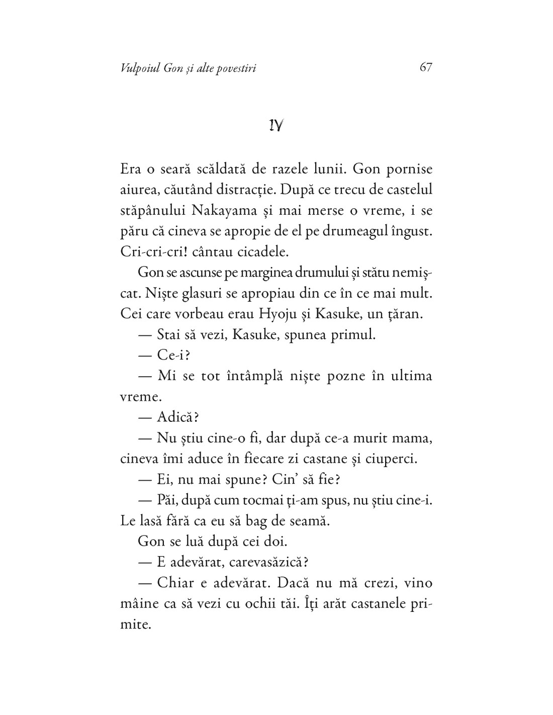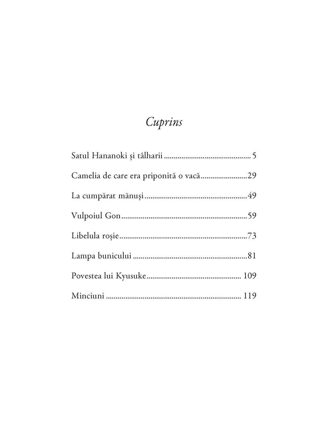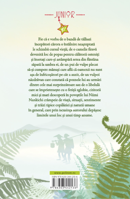 Fie că e vorba de o bandă de tâlhari începători cărora o întâlnire neașteptată le schimbă cursul vieţii, de o camelie firavă devenită loc de popas pentru călătorii osteniţi și însetaţi care-și astâmpără setea din fântâna săpată la umbra ei, de un pui de vulpe plecat să-și cumpere mănuși care află că oamenii nu sunt așa de înfricoșători pe cât a auzit, de un vulpoi năzdrăvan care constată că poznele lui au urmări dintre cele mai surprinzătoare sau de o libelulă care se împrietenește cu o fetiţă zglobie, cititorii mici și mari descoperă în poveștile lui Niimi Nankichi crâmpeie de viaţă, situaţii, sentimente și trăiri tipice copilăriei și naturii umane în general, care prin iscusinţa autorului depășesc limitele unui loc și unui timp anume.