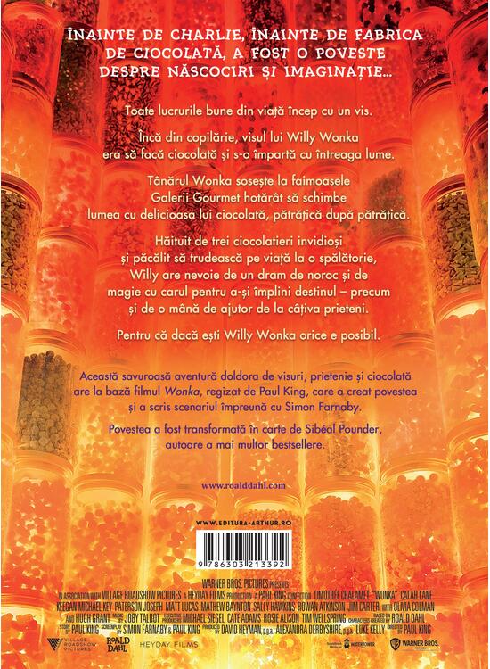 Această savuroasă aventură doldora de visuri, prietenie și ciocolată are la bază filmul Wonka, regizat de Paul King, care a creat povestea şi a scris scenariul împreună cu Simon Farnaby. Povestea a fost transformată în carte de Sibéal Pounder, autoare a mai multor bestsellere.