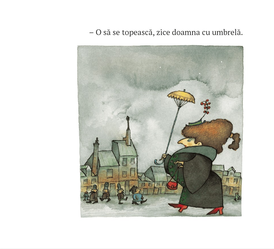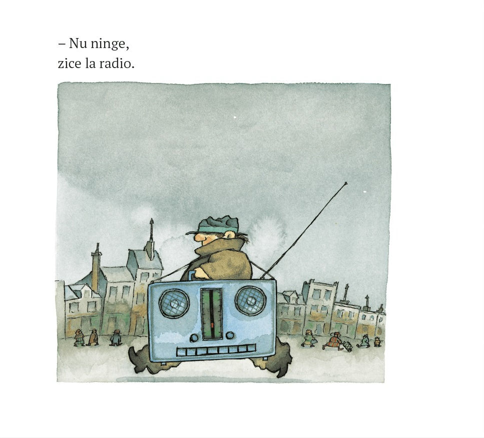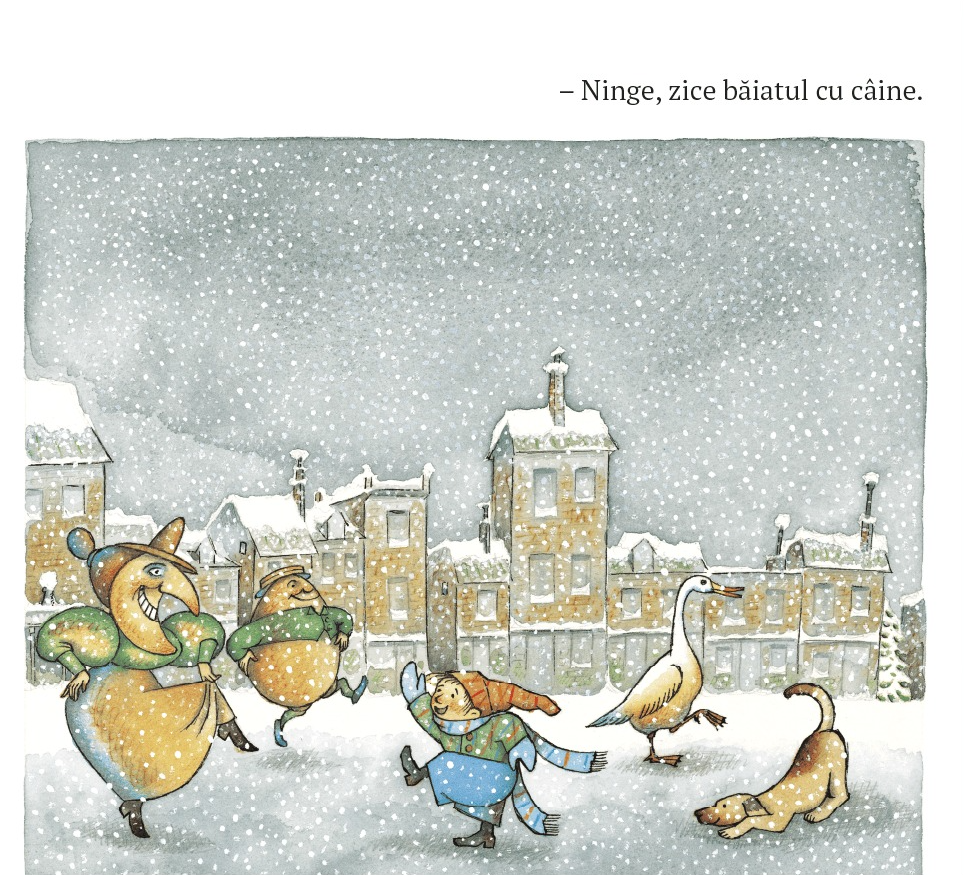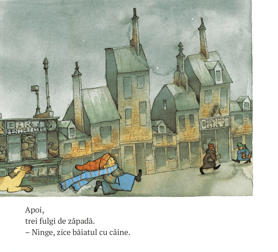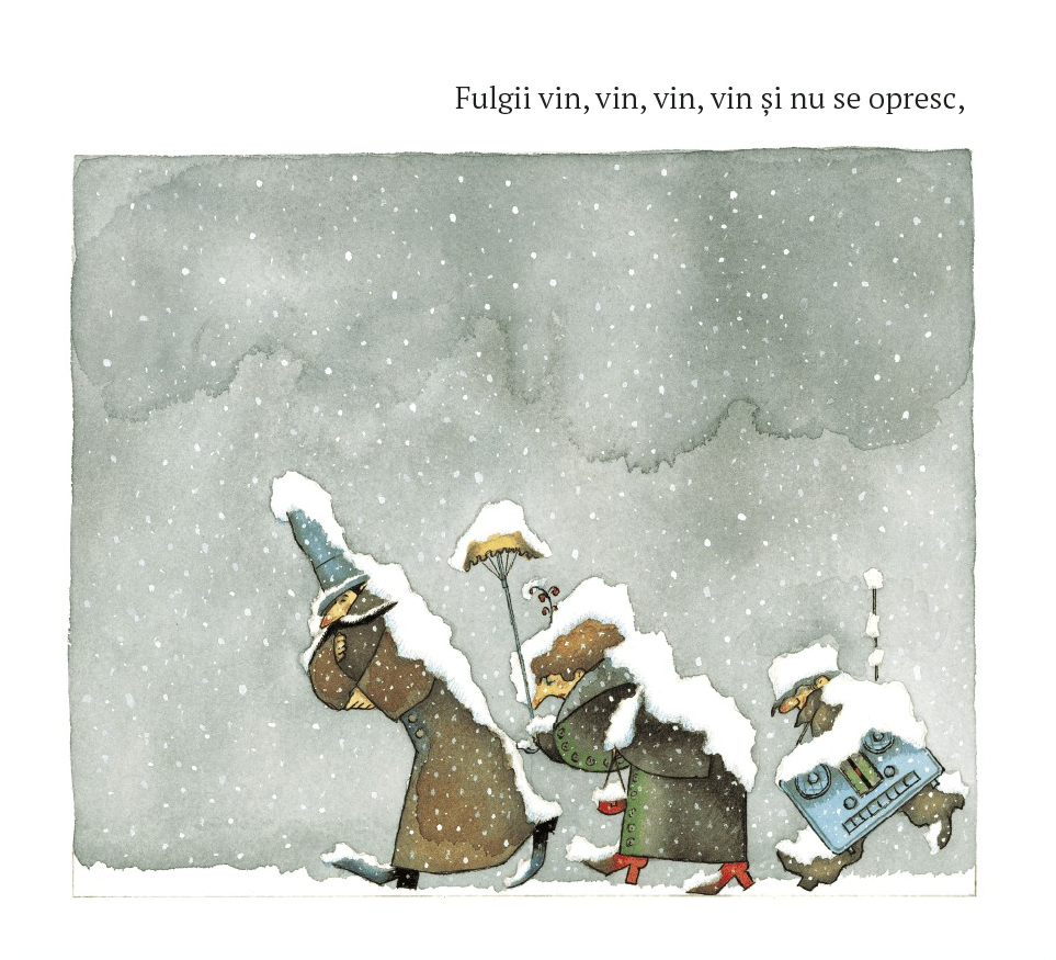 Scrisă și ilustrată din perspectiva unui copil, cartea transmite starea de liniște din lume atunci când începe să ningă și zăpada se așterne peste oraș.