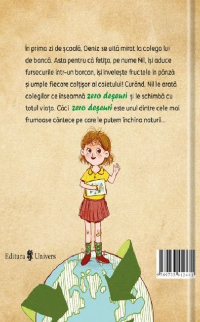 În prima zi de şcoală, Deniz se uită mirat la colega lui de bancă. Asta pentru că fetiţa, pe nume Nil, îşi aduce fursecurile într-un borcan, îşi înveleşte fructele în pânză şi umple fiecare colţişor al caietului! Curând, Nil le arată colegilor ce înseamnă zero deşeuri şi le schimbă cu totul viaţa. Căci zero deşeuri este unul dintre cele mai frumoase cântece pe care le putem închina naturii…