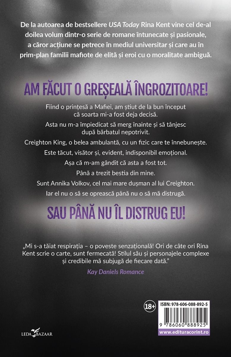 De la autoarea de bestsellere USA Today Rina Kent vine cel de‑al doilea volum dintr-o serie de romane întunecate și pasionale, a căror acțiune se petrece în mediul universitar și care au în prim‑plan familii mafiote de elită și eroi cu o moralitate ambiguă. Un dark romance care te va cuceri.