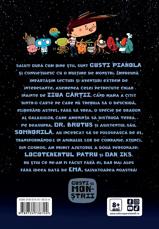 Salut! După cum bine știi, sunt GUSTI PIANOLA și conviețuiesc cu o mulțime de monștri. Împreună împărtășim lecturi și aventuri extrem de interesante, asemenea celei petrecute chiar înainte de ZIUA CĂRȚII, când mama a citit dintr-o carte pe care nu trebuia să o deschidă, eliberând astfel, fără să vrea, o specie de dragon al galaxiilor, care amenința să distrugă Terra.