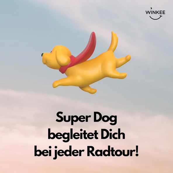 Cățelușul cu pelerină este atașat de bicicletă și asigură o dispoziție bună la fiecare plimbare. Un detaliu original pentru toți cei care iubesc umorul - și superputerile, bineînțeles!