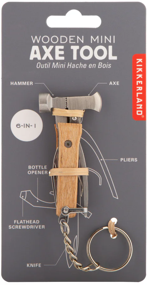 Fii pregătit pentru orice cu acest mini topor multifuncțional. Include 6 unelte: mini topor, ciocan, desfăcător de sticle, șurubelniță cu cap plat, clește și cuțit.