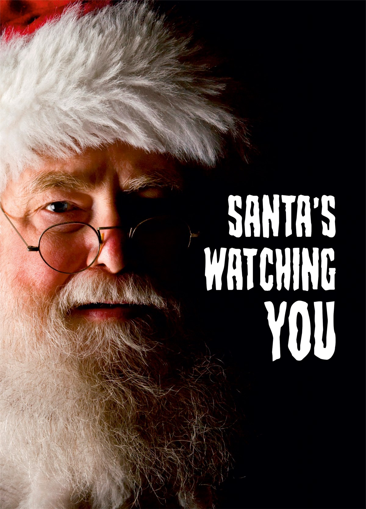 Felicitare ilustrata cu mesaj - Santa's watching you. Are interiorul gol pentru propriul text si vine insotita de plic.