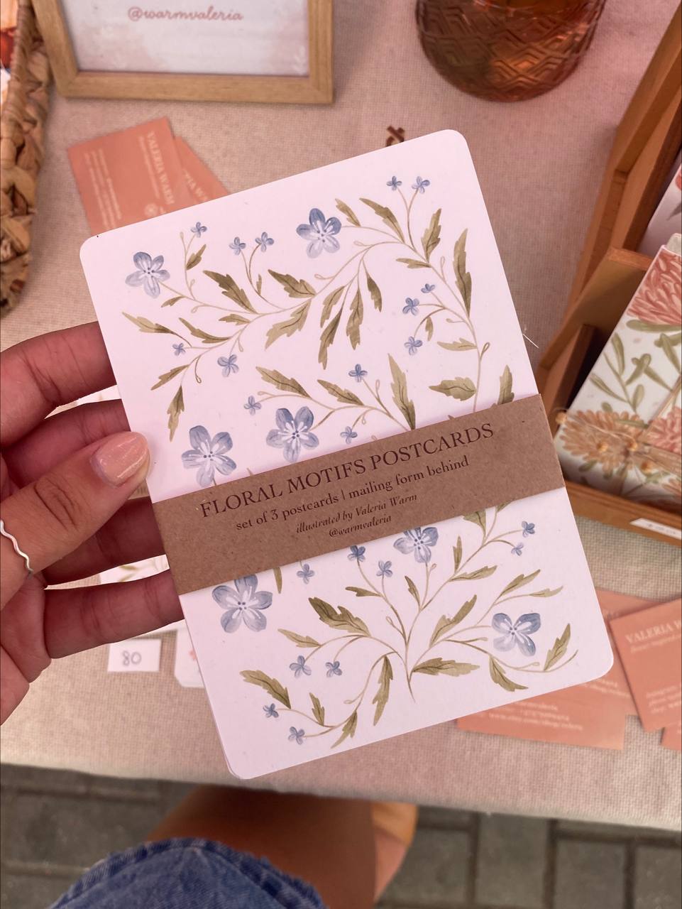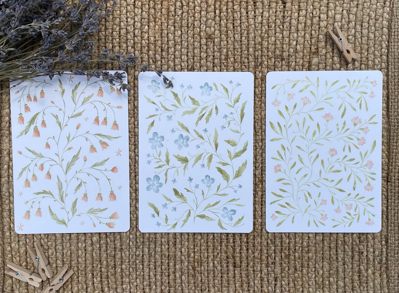 Set de 3 felicitări unice cu model floral în albastru, roz și portocaliu. Pe verso există spațiu tipărit pentru mesaj sau pentru expediere prin poștă.