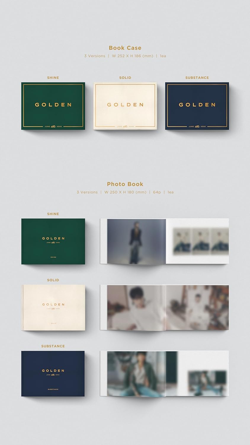 After landing at the top of the Billboard Hot 100 with hit single 'Seven (feat. Latto)', Jung Kook of BTS has officially arrived with his debut album titled 'GOLDEN' - available in 3 versions: 'SHINE', 'SOLID' and 'SUBSTANCE'. Contents of the album include CD, out sleeve, CD envelope, photo book (64 pages), photo card (EU exclusive), post card, poster, contents envelope and two symbol stickers.