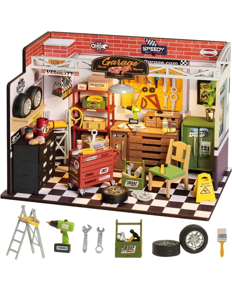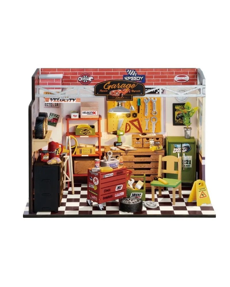 Rolife vă aduce ceea ce toată lumea își dorește acasă: atelierul perfect din garaj. Construită cu o acuratețe uimitoare, această minune în miniatură surprinde dragostea ta pentru bricolaj cu rafturi, sertare, dulapuri, cutii, roți, furtunuri, unelte, mănuși și accesorii realizate cu precizie. Avem detalii bătute în cuie, cum ar fi semnul pliabil pentru podea umedă, placa cu cuie, cutia de instrumente, adezivii, planta în ghiveci, cărămizile, podeaua clasică de tablă de șah și multe altele. Camera este bine iluminată de o lampă cu LED deasupra capului. Fiecare spațiu este optimizat așa cum este tipic pentru garajul ideal de acasă. Culorile și texturile prezinta un spațiu vesel și productiv în care ideile fantastice devin realitate.