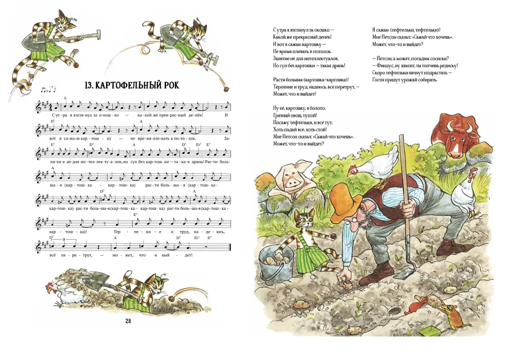 Петсон, Финдус и другие герои Свена Нурдквиста вновь поют и пляшут! Хотите вместе с ними исполнить картофельный рок, лисий блюз или колыбельную для Финдуса? В этом сборнике - 24 песни с нотами для фортепьяно и аккордами для гитары! Идея сочинить песни по мотивам книг о Петсоне и Финдусе родилась у шведского музыкального коллектива "Братья Слют", возглавляемого музыкантом и композитором Свеном Хедманом. Песни можно не только разучить на гитаре или фортепьяно, но также послушать или скачать на музыкальных сервисах Spotify, Apple Music, Youtube Music и др.