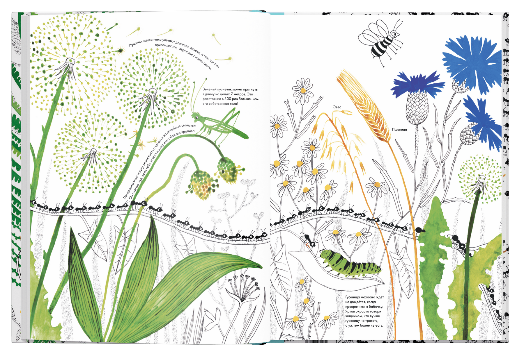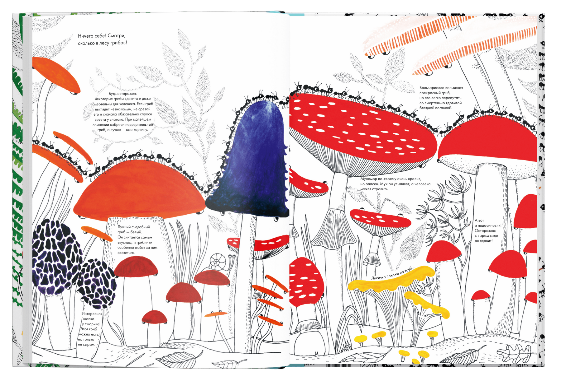 На каждом развороте художница спрятала муравья в красных носках - его нам придется найти и выручить из небольших неприятностей: то он отстал от друзей, то свалился с еловой ветки, то забрался на огромный цветок.