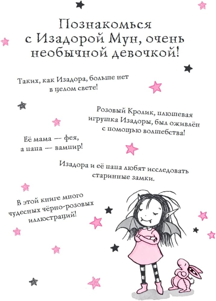 Изадора Мун - очень необычная девочка! Она обожает розовый и чёрный цвет, умеет летать и пользоваться волшебной палочкой. Её мама - фея, а папа - вампир! Поэтому Изадора знает: быть не таким, как все, не всегда просто, зато ужасно интересно! Но когда пришло время выбрать себе школу, Изадора растерялась: куда же ей пойти - в школу для фей или для вампиров? И там, и там девочку ждёт много испытаний. Но главное - не бояться быть таким, какой ты есть. И тогда всё получится!Гарриет Манкастер - всемирно известная писательница и иллюстратор, книги которой переведены на 27 языков!