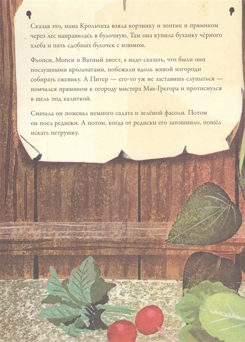 Питер - очень непоседливый кролик. В отличие от своих братьев и сестёр, он обожает проказничать. И даже, когда мама-крольчиха запретила ему наведываться на ферму мистера Мак-Грегора, он и не думает слушаться. Питер пробирается в запретный огород и вдоволь лакомится овощами. Вот только старик Мак-Грегор заметил маленького обжору. Что же теперь будет? Нежели Питера поймают, как когда-то поймали его отца?